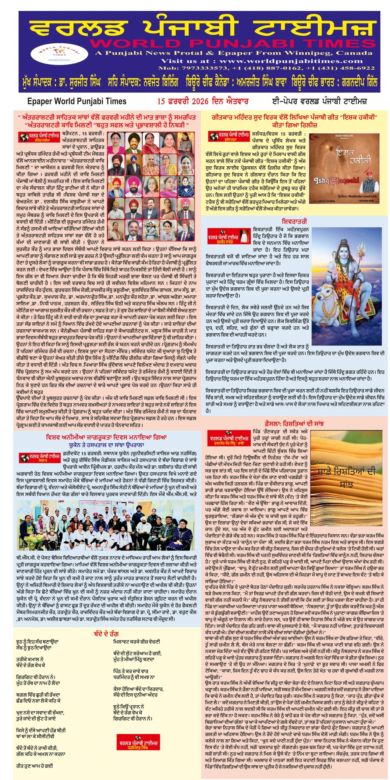 Posted inਈ-ਪੇਪਰ World Punjabi Times-15.02.2026 15.02.2026Download Posted by worldpunjabitimes February 15, 2026