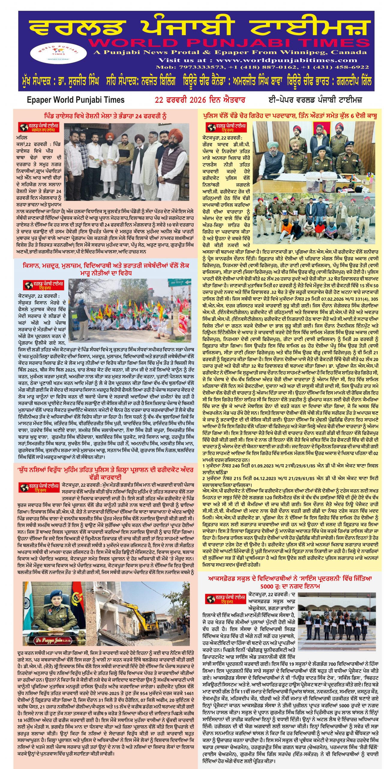 Posted inਪੰਜਾਬ ਪੁਲਿਸ ਵੱਲੋਂ ਵੱਡੇ ਚੋਰ ਗਿਰੋਹ ਦਾ ਪਰਦਾਫਾਸ਼, ਤਿੰਨ ਔਰਤਾਂ ਸਮੇਤ ਕੁੱਲ 6 ਦੋਸ਼ੀ ਕਾਬੂ ਕੋਟਕਪੂਰਾ, 22 ਫਰਵਰੀ (ਟਿੰਕੂ ਕੁਮਾਰ/ਵਰਲਡ ਪੰਜਾਬੀ ਟਾਈਮਜ਼) ਗੌਰਵ ਯਾਦਵ ਡੀ.ਜੀ.ਪੀ. ਪੰਜਾਬ ਦੇ ਨਿਰਦੇਸ਼ਾਂ ਤਹਿਤ ਮਾੜੇ ਅਨਸਰਾ ਖਿਲਾਫ ਜੀਰੋ ਟਾਲਰੈਸ ਨੀਤੀ ਤਹਿਤ ਕਾਰਵਾਈ ਕਰਦੇ ਹੋਏ ਫਰੀਦਕੋਟ ਪੁਲਿਸ ਵੱਲੋਂ ਨਿਲਾਂਬਰੀ ਜਗਦਲੇ ਆਈ.ਜੀ.… Posted by worldpunjabitimes February 22, 2026 Posted inਪੰਜਾਬ ਕਿਸਾਨ, ਮਜ਼ਦੂਰ, ਮੁਲਾਜ਼ਮ, ਵਿਦਿਆਰਥੀ ਅਤੇ ਭਰਾਤਰੀ ਜਥੇਬੰਦੀਆਂ ਵੱਲੋਂ ਲੋਕ ਮਾਰੂ ਨੀਤੀਆਂ ਦਾ ਵਿਰੋਧ ਕੋਟਕਪੂਰਾ, 22 ਫਰਵਰੀ ( ਵਰਲਡ ਪੰਜਾਬੀ ਟਾਈਮਜ਼) ਸੰਯੁਕਤ ਕਿਸਾਨ ਮੋਰਚੇ ਦੇ ਫੈਸਲੇ ਮੁਤਾਬਕ ਕੇਂਦਰ ਵਿੱਚ ਮੋਦੀ ਸਰਕਾਰ ਦੇ ਲੀਡਰਾਂ ਦੇ ਘਰਾਂ ਅੱਗੇ ਅਤੇ ਪੰਜਾਬ ਸਰਕਾਰ ਦੇ ਮੰਤਰੀਆਂ ਦੇ ਘਰਾਂ ਅੱਗੇ… Posted by worldpunjabitimes February 22, 2026