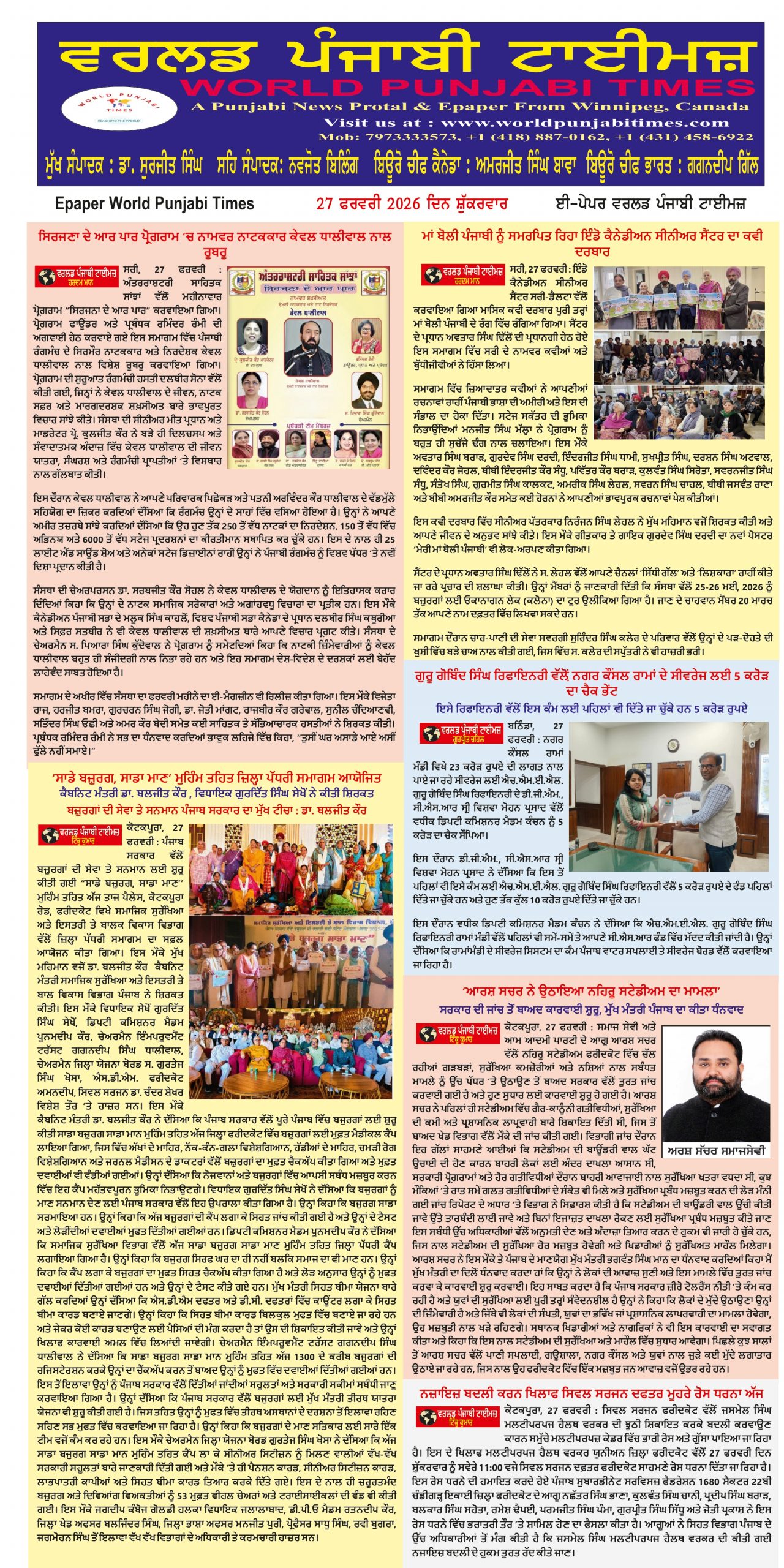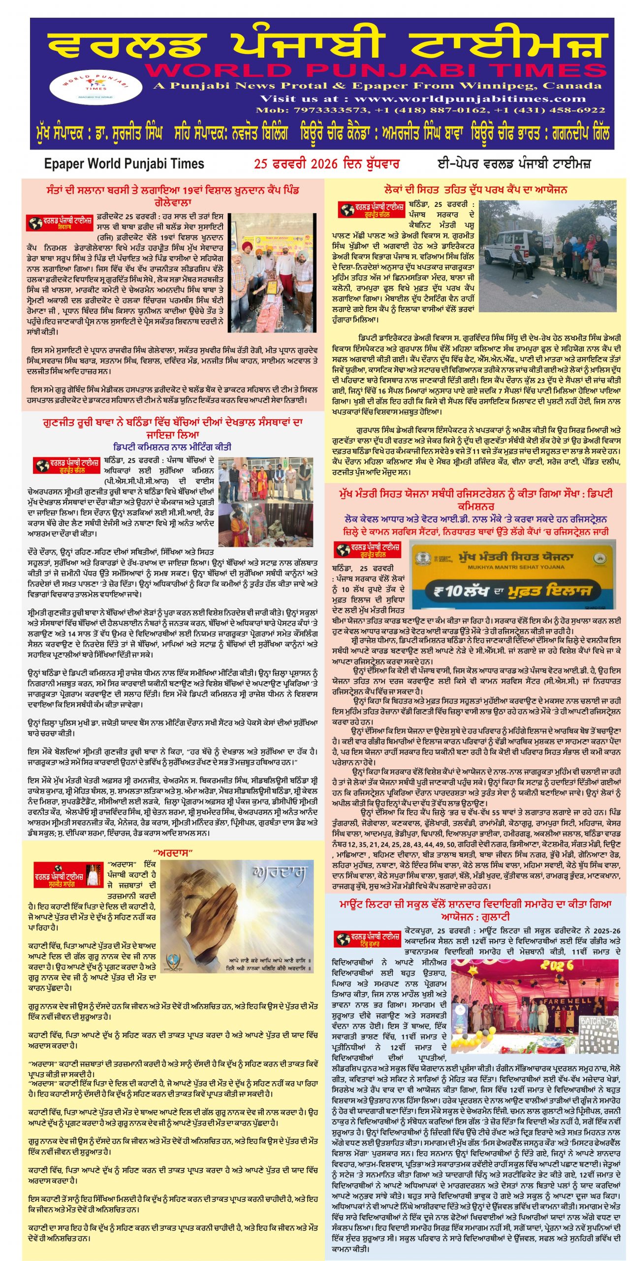 Posted inਈ-ਪੇਪਰ World Punjabi Times-25.02.2026 25.02.2026Download Posted by worldpunjabitimes February 25, 2026 Posted inਪੰਜਾਬ ਮਾਊਂਟ ਲਿਟਰਾ ਜ਼ੀ ਸਕੂਲ ਵੱਲੋਂ ਸ਼ਾਨਦਾਰ ਵਿਦਾਇਗੀ ਸਮਾਰੋਹ ਦਾ ਕੀਤਾ ਗਿਆ ਆਯੋਜਨ : ਗੁਲਾਟੀ ਕੋਟਕਪੂਰਾ, 25 ਫਰਵਰੀ (ਟਿੰਕੂ ਕੁਮਾਰ/ਵਰਲਡ ਪੰਜਾਬੀ ਟਾਈਮਜ਼) ਮਾਊਂਟ ਲਿਟਰਾ ਜ਼ੀ ਸਕੂਲ ਫਰੀਦਕੋਟ ਨੇ 2025-26 ਅਕਾਦਮਿਕ ਸੈਸ਼ਨ ਲਈ 12ਵੀਂ ਜਮਾਤ ਦੇ ਵਿਦਿਆਰਥੀਆਂ ਲਈ ਇੱਕ ਗੰਭੀਰ ਅਤੇ ਭਾਵਨਾਤਮਕ ਵਿਦਾਇਗੀ ਸਮਾਰੋਹ ਦੀ ਮੇਜ਼ਬਾਨੀ… Posted by worldpunjabitimes February 25, 2026 Posted inਪੰਜਾਬ ਟ੍ਰੈਫਿਕ ਨਿਯਮਾਂ ਦੀ ਉਲੰਘਣਾ ਕਰਨ ਵਾਲਿਆਂ ਖਿਲਾਫ਼ ਹੋਵੇਗੀ ਸਖ਼ਤ ਕਾਰਵਾਈ : ਆਰ.ਟੀ.ਏ. ਨਿਯਮ ਤੋੜਨ ਵਾਲਿਆਂ ਨਾਲ ਕਿਸੇ ਕਿਸਮ ਦੀ ਢਿੱਲ ਨਹੀਂ ਵਰਤੀ ਜਾਵੇਗੀ ਕੋਟਕਪੂਰਾ, 25 ਫਰਵਰੀ (ਟਿੰਕੂ ਕੁਮਾਰ/ਵਰਲਡ ਪੰਜਾਬੀ ਟਾਈਮਜ਼) ਰੀਜਨਲ ਟਰਾਂਸਪੋਰਟ ਅਫ਼ਸਰ (ਆਰ.ਟੀ.ਏ) ਫ਼ਰੀਦਕੋਟ ਸ੍ਰੀ ਅਮਨਦੀਪ ਨੇ ਜਾਣਕਾਰੀ ਦਿੰਦਿਆਂ ਦੱਸਿਆ ਕਿ… Posted by worldpunjabitimes February 25, 2026 Posted inਪੰਜਾਬ ਗੁਣਜੀਤ ਰੂਚੀ ਬਾਵਾ ਨੇ ਬਠਿੰਡਾ ਵਿੱਚ ਬੱਚਿਆਂ ਦੀਆਂ ਦੇਖਭਾਲ ਸੰਸਥਾਵਾਂ ਦਾ ਜਾਇਜ਼ਾ ਲਿਆ ਡਿਪਟੀ ਕਮਿਸ਼ਨਰ ਨਾਲ ਮੀਟਿੰਗ ਕੀਤੀ ਬਠਿੰਡਾ, 25 ਫਰਵਰੀ (ਗੁਰਪ੍ਰੀਤ ਚਹਿਲ/ਵਰਲਡ ਪੰਜਾਬੀ ਟਾਈਮਜ਼) ਪੰਜਾਬ ਬੱਚਿਆਂ ਦੇ ਅਧਿਕਾਰਾਂ ਲਈ ਸੁਰੱਖਿਆ ਕਮਿਸ਼ਨ (ਪੀ.ਐਸ.ਸੀ.ਪੀ.ਸੀ.ਆਰ)… Posted by worldpunjabitimes February 25, 2026 Posted inਪੰਜਾਬ ਫਰੀਦਕੋਟ ਪੁਲਿਸ ਨੇ ਵੱਡੀ ਵਾਰਦਾਤ ਨੂੰ ਨਾਕਾਮ ਕਰਦਿਆਂ ਇਕ ਮੁਲਜ਼ਮ ਨੂੰ ਨਜਾਇਜ ਅਸਲੇ ਸਮੇਤ ਕੀਤਾ ਕਾਬੂ ਗ੍ਰਿਫ਼ਤਾਰ ਦੋਸ਼ੀਆਂ ਖ਼ਿਲਾਫ ਪਹਿਲਾਂ ਹੀ ਸੰਗੀਨ ਧਾਰਾਵਾਂ ਤਹਿਤ ਪਹਿਲਾ 3 ਮਾਮਲੇ ਦਰਜ ਸੁਰੱਖਿਅਤ ਜਿਲ੍ਹਾ ਬਣਾਉਣ ਲਈ ਪੁਲਿਸ ਪ੍ਰਸ਼ਾਸ਼ਨ ਪੂਰੀ ਤਰ੍ਹਾ ਵਚਨਬੱਧ ਕੋਟਕਪੂਰਾ, 25 ਫਰਵਰੀ (ਟਿੰਕੂ ਕੁਮਾਰ/ਵਰਲਡ ਪੰਜਾਬੀ ਟਾਈਮਜ਼) ਡਾ. ਪ੍ਰਗਿਆ… Posted by worldpunjabitimes February 25, 2026 Posted inਪੰਜਾਬ ਮੁੱਖ ਮੰਤਰੀ ਸਿਹਤ ਯੋਜਨਾ ਸਬੰਧੀ ਰਜਿਸਟਰੇਸ਼ਨ ਨੂੰ ਕੀਤਾ ਗਿਆ ਸੌਖਾ : ਡਿਪਟੀ ਕਮਿਸ਼ਨਰ ਲੋਕ ਕੇਵਲ ਆਧਾਰ ਅਤੇ ਵੋਟਰ ਆਈ.ਡੀ. ਨਾਲ ਮੌਕੇ 'ਤੇ ਕਰਵਾ ਸਕਦੇ ਹਨ ਰਜਿਸਟ੍ਰੇਸ਼ਨ ਜ਼ਿਲ੍ਹੇ ਦੇ ਕਾਮਨ ਸਰਵਿਸ ਸੈਂਟਰਾਂ, ਨਿਰਧਾਰਤ ਥਾਵਾਂ ਉੱਤੇ ਲੱਗੇ ਕੈਂਪਾਂ 'ਚ ਰਜਿਸਟ੍ਰੇਸ਼ਨ ਜਾਰੀ … Posted by worldpunjabitimes February 25, 2026