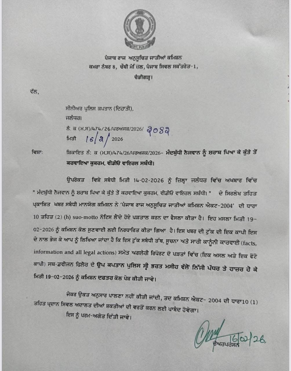 Posted inਪੰਜਾਬ ਸੂ ਮੋਟੋ ਡੀਐੱਸਪੀ ਫਿਲੌਰ ਅਤੇ ਐੱਸਐੱਸਪੀ ਤੋ ਰਿਪੋਰਟ ਤਲਬ ਮੰਦਬੁੱਧੀ ਦਲਿਤ ਨੌਜਵਾਨ ਨਾਲ ਕੁੱਤੇ ਤੋਂ ਕੁਕਰਮ ਕਰਵਾਉਣ ਦੇ ਮਾਮਲੇ ਵਿੱਚ ਐਸ.ਸੀ.ਕਮਿਸ਼ਨ ਵਲੋਂ ਜਲੰਧਰ ਦਿਹਾਤੀ ਦੇ ਐਸ.ਐਸ.ਪੀ. ਤੋਂ ਰਿਪੋਰਟ ਤਲਬ ਚੰਡੀਗੜ੍ਹ, 16 ਫਰਵਰੀ (ਵਰਲਡ ਪੰਜਾਬੀ ਟਾਈਮਜ਼) ਪੰਜਾਬ ਰਾਜ ਅਨੁਸੂਚਿਤ ਜਾਤੀਆਂ… Posted by worldpunjabitimes February 16, 2026