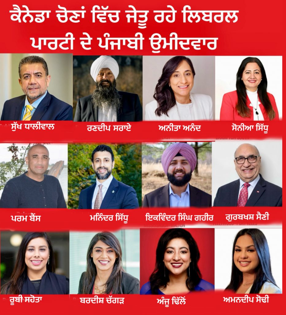 ਕੈਨੇਡਾ ਵਿਚ 28 ਅਪ੍ਰੈਲ ਨੂੰ ਹੋਈਆਂ ਫੈਡਰਲ ਚੋਣਾਂ ਵਿਚ ਲਿਬਰਲ ਪਾਰਟੀ ਨੇ 169 ਸੀਟਾਂ ਤੇ ਜਿੱਤ/ਲੀਡ ਹਾਸਲ ਕਰ ਲਈ ਹੈ, ਕਸੰਰਵੇਟਿਵ ਦੇ 144, ਕਿਊਬਿਕ ਦੇ 22, ਐਨ.ਡੀ.ਪੀ. ਦੇ 7 ਅਤੇ ਗਰੀਨ ਪਾਰਟੀ ਦੇ 1 ਉਮੀਵਾਰ ਨੂੰ ਸਫਲਤਾ ਮਿਲੀ ਹੈ। ਇਲੈਕਸ਼ਨਜ਼ ਕੈਨੇਡਾ ਵੱਲੋਂ ਦਰਸਾਈ ਜਾ ਰਹੀ ਤਾਜ਼ਾ ਸਥਿਤੀ ਅਨਸਾਰ ਇਸ ਵਾਰ 22 ਪੰਜਾਬੀ ਉਮੀਦਵਾਰਾਂ ਨੇ ਸਫਲਤਾ ਨੂੰ ਚੁੰਮਿਆਂ ਹੈ ਜਦੋਂ ਕਿ 2021 ਵਿਚ ਹੋਈਆਂ ਚੋਣਾਂ ਵਿਚ 15 ਪੰਜਾਬੀ ਉਮੀਦਵਾਰ ਪਾਰਲੀਮੈਂਟ ਵਿਚ ਪਹੁੰਚੇ ਸਨ। ਚੁਣੇ ਗਏ 22 ਉਮੀਦਵਾਰਾਂ ਵਿੱਚ ਲਿਬਰਲ ਪਾਰਟੀ ਦੇ 12 ਅਤੇ ਕੰਸਰਵੇਟਿਵ ਪਾਰਟੀ ਦੇ 10 ਉਮੀਦਵਾਰ ਸ਼ਾਮਲ ਹਨ। ਇਹਨਾਂ ਵਿੱਚੋਂ 11 ਉਮੀਦਵਾਰ ਓਨਟਾਰੀਓ ਸੂਬੇ ਨਾਲ ਸਬੰਧਤ ਹਨ, 5 ਬੀ.ਸੀ. ਨਾਲ, 5 ਅਲਬਰਟਾ ਨਾਲ ਸਬੰਧਤ ਹਨ ਅਤੇ ਇਕ ਉਮੀਦਵਾਰ ਕਿਊਬਿਕ ਨਾਲ ਸੰਬਧਤ ਹੈ।
