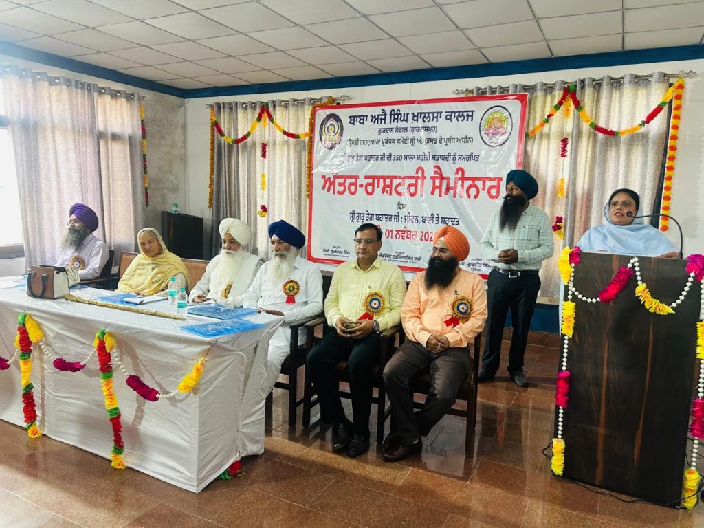 ਐਡਵੋਕੇਟ ਹਰਜਿੰਦਰ ਸਿੰਘ ਧਾਮੀ,ਪ੍ਰਧਾਨ ਸ਼੍ਰੋਮਣੀ ਗੁਰਦੁਆਰਾ ਪ੍ਰਬੰਧਕ ਕਮੇਟੀ ਅਤੇ ਸ੍ਰ.ਸੁਖਮਿੰਦਰ ਸਿੰਘ ਵਿੱਦਿਆ ਸਕੱਤਰ, ਸ਼੍ਰੋਮਣੀ ਗੁਰਦੁਆਰਾ ਪ੍ਰਬੰਧਕ ਕਮੇਟੀ ਦੀ ਸਰਪ੍ਰਸਤੀ ਹੇਠ , ਪ੍ਰਿੰਸੀਪਲ ਡਾ.ਗੁਰਜੀਤ ਸਿੰਘ ਦੀ ਦੇਖ-ਰੇਖ ਅਧੀਨ ਚੱਲ ਰਹੇ ਬਾਬਾ ਅਜੈ ਸਿੰਘ ਖਾਲਸਾ ਕਾਲਜ ਗੁਰਦਾਸਨੰਗਲ ਵਿਖੇ ਮਿਤੀ 1 ਨਵੰਬਰ ਦਿਨ ਸ਼ਨੀਵਾਰ ਨੂੰ ਸ੍ਰੀ ਗੁਰੂ ਤੇਗ ਬਹਾਦਰ ਜੀ ਦੀ 350 ਸਾਲਾ ਸ਼ਹੀਦੀ ਸ਼ਤਾਬਦੀ ਨੂੰ ਸਮਰਪਿਤ ਅੰਤਰਰਾਸ਼ਟਰੀ ਸੈਮੀਨਾਰ ਕਰਵਾਇਆ ਗਿਆ। ਸੈਮੀਨਾਰ ਦਾ ਵਿਸ਼ਾ ਸ੍ਰੀ ਗੁਰੂ ਤੇਗ ਬਹਾਦਰ ਜੀ : ਜੀਵਨ, ਬਾਣੀ ਅਤੇ ਸ਼ਹਾਦਤ ਵਿਸ਼ੇ ਨਾਲ ਸਬੰਧਿਤ ਸੀ। ਕਾਲਜ ਪ੍ਰਿੰਸੀਪਲ ਡਾ.ਗੁਰਜੀਤ ਸਿੰਘ ਨੇ ਆਪਣੇ ਸਵਾਗਤੀ ਭਾਸ਼ਣ ਰਾਹੀਂ ਆਏ ਹੋਏ ਮਹਿਮਾਨ ਵਿਦਵਾਨ ਸਾਹਿਬਾਨ ਦਾ ਸਵਾਗਤ ਕੀਤਾ। ਇਸ ਮੌਕੇ ਪ੍ਰੋਫੈਸਰ ਬਾਬਾ ਨਿਰਮਲ ਸਿੰਘ ਰੰਧਾਵਾ ਅੰਤਰਰਾਸ਼ਟਰੀ ਗਤਕਾ ਕੋਚ ਨੇ ਮੁੱਖ ਮਹਿਮਾਨ ਵਜੋਂ ਸ਼ਿਰਕਤ ਕੀਤੀ। ਡਾ. ਨਰੇਸ਼, ਐਸੋਸੀਏਟ ਪ੍ਰੋਫ਼ੈਸਰ ਤੇ ਮੁੱਖੀ ਪੰਜਾਬੀ ਤੇ ਡੋਗਰੀ ਵਿਭਾਗ ਕੇਂਦਰੀ ਯੂਨੀਵਰਸਿਟੀ ਹਿਮਾਚਲ ਪ੍ਰਦੇਸ਼ ਨੇ ਕੁੰਜੀਵਤ ਭਾਸ਼ਣ ਨਾਲ ਸੈਮੀਨਾਰ ਦਾ ਆਗਾਜ਼ ਕੀਤਾ। ਇਸ ਉਪਰੰਤ ਮੁੱਖ ਮਹਿਮਾਨ ਪ੍ਰੋ. ਬਾਬਾ ਨਿਰਮਲ ਸਿੰਘ ਰੰਧਾਵਾ ਨੇ ਗੁਰੂ ਸਾਹਿਬ ਦੇ ਜੀਵਨ ਅਤੇ ਸ਼ਹਾਦਤ ਸਬੰਧੀ ਆਪਣੇ ਵਿਚਾਰ ਸਾਂਝੇ ਕੀਤੇ। ਉਪਰੰਤ ਡਾ. ਹਰਜਿੰਦਰ ਕੌਰ ਸੋਹਲ, ਪੰਜਾਬੀ ਅਧਿਐਨ ਸਕੂਲ ਗੁਰੂ ਨਾਨਕ ਦੇਵ ਯੂਨੀਵਰਸਿਟੀ ਅੰਮ੍ਰਿਤਸਰ ਨੇ ਉਚੇਚੇ ਤੌਰ ਤੇ ਗੁਰੂ ਸਾਹਿਬ ਦੇ ਜੀਵਨ ਦਰਸ਼ਨ ਤੇ ਚਾਨਣਾ ਪਾਇਆ। ਬੀਬੀ ਜਸਬੀਰ ਕੌਰ ਜਫ਼ਰਵਾਲ ਅਤੇ ਸ੍ਰ. ਗੁਰਿੰਦਰਪਾਲ ਸਿੰਘ ਗੋਰਾ ਮੈਂਬਰ ਸ਼੍ਰੋਮਣੀ ਗੁਰਦੁਆਰਾ ਪ੍ਰਬੰਧਕ ਕਮੇਟੀ ਨੇ ਵਿਸ਼ੇਸ ਮਹਿਮਾਨ ਵਜੋਂ ਸ਼ਿਰਕਤ ਕੀਤੀ। ਸ੍ਰ. ਗੁਰਿੰਦਰਪਾਲ ਸਿੰਘ ਗੋਰਾ ਨੇ ਸ਼੍ਰੋਮਣੀ ਗੁਰਦੁਆਰਾ ਪ੍ਰਬੰਧਕ ਕਮੇਟੀ ਵੱਲੋਂ ਸ਼ਤਾਬਦੀ ਸਮਾਰੋਹ ਸਬੰਧੀ ਉਲੀਕੇ ਗਏ ਪ੍ਰੋਗਰਾਮਾਂ ਬਾਰੇ ਜਾਣਕਾਰੀ ਸਾਂਝੀ ਕਰਦੇ ਹੋਏ ਗੁਰੂ ਤੇਗ ਬਹਾਦਰ ਜੀ, ਭਾਈ ਮਤੀ ਦਾਸ, ਭਾਈ ਸਤੀ ਦਾਸ ਅਤੇ ਭਾਈ ਦਿਆਲਾ ਜੀ ਦੀ ਅਦੁੱਤੀ ਸ਼ਹਾਦਤ ਦੇ ਸੰਦਰਭ ਵਿੱਚ ਆਪਣੇ ਵਿਚਾਰ ਸਾਂਝੇ ਕੀਤੇ। ਡਾ.ਗੁਰਵੰਤ ਸਿੰਘ ਮੁਖੀ ਪੰਜਾਬੀ ਵਿਭਾਗ ਐੱਸ. ਐਲ.ਬਾਵਾ.ਡੀ.ਏ.ਵੀ.ਕਾਲਜ ਬਟਾਲਾ, ਡਾ.ਗੁਰਬੀਰ ਸਿੰਘ ਬਰਾੜ ਮੁਖੀ ਪੰਜਾਬੀ ਵਿਭਾਗ ਗੁਰੂ ਨਾਨਕ ਕਾਲਜ ਬਟਾਲਾ, ਡਾ.ਗੁਰਜੰਟ ਸਿੰਘ ਮੁਖੀ ਪੰਜਾਬੀ ਵਿਭਾਗ ਤ੍ਰੈ ਸ਼ਤਾਬਦੀ ਗੁਰੂ ਗੋਬਿੰਦ ਸਿੰਘ ਖਾਲਸਾ ਕਾਲਜ ਅੰਮ੍ਰਿਤਸਰ, ਪ੍ਰੋ. ਕੰਵਲਜੀਤ ਕੌਰ ਮੁਖੀ ਹਿੰਦੀ ਵਿਭਾਗ ਐਸ.ਐਸ.ਐਮ.ਕਾਲਜ ਦੀਨਾਨਗਰ, ਪ੍ਰੋ. ਅਕਾਸ਼ਬੀਰ ਸਿੰਘ ਸਹਾਇਕ ਪ੍ਰੋਫ਼ੈਸਰ ਸੰਤ ਸਿੰਘ ਸੁੱਖਾ ਸਿੰਘ ਕਾਲਜ ਆਫ ਕਮਰਸ ਅਤੇ ਅਲਾਈਡ ਸਟੱਡੀਜ਼, ਡਾ. ਸਤਿੰਦਰਜੀਤ ਕੌਰ ਬੁੱਟਰ ਲੈਕਚਰਾਰ ਬਟਾਲਾ ਨੇ ਗੁਰੂ ਸਾਹਿਬ ਦੇ ਜੀਵਨ , ਬਾਣੀ ਅਤੇ ਸ਼ਹਾਦਤ ਆਦਿ ਵਿਸ਼ਿਆਂ ਤੇ ਆਪਣੇ ਖੋਜ ਪੱਤਰ ਪੇਸ਼ ਕੀਤੇ। ਸੈਮੀਨਾਰ ਦੀ ਸਮਾਪਤੀ ਤੇ ਡਾ. ਨਿਰਮਲ ਸਿੰਘ ਸਹਾਇਕ ਪ੍ਰੋਫ਼ੈਸਰ ਰਾਜਨੀਤੀ ਸ਼ਾਸਤਰ ਵਿਭਾਗ ਗੁਰੂ ਨਾਨਕ ਦੇਵ ਯੂਨੀਵਰਸਿਟੀ ਅੰਮ੍ਰਿਤਸਰ ਨੇ ਆਪਣੇ ਪ੍ਰਧਾਨਗੀ ਭਾਸ਼ਣ ਰਾਹੀਂ ਸੈਮੀਨਾਰ ਦੇ ਵਿਸ਼ੇ ਦੇ ਸੰਦਰਭ ਵਿੱਚ ਆਪਣੇ ਵਿਚਾਰ ਪੇਸ਼ ਕੀਤੇ। ਕਾਲਜ ਪ੍ਰੋਫ਼ੈਸਰ ਰਮਨਦੀਪ ਕੌਰ ਪੰਜਾਬੀ ਵਿਭਾਗ ਨੇ ਮੰਚ ਸੰਚਾਲਕ ਦੀ ਭੂਮਿਕਾ ਬਾਖੂਬੀ ਨਿਭਾਈ। ਕਾਲਜ ਪ੍ਰਿੰਸੀਪਲ ਡਾ.ਗੁਰਜੀਤ ਸਿੰਘ ਨੇ ਆਏ ਹੋਏ ਮਹਿਮਾਨਾਂ ਦਾ ਧੰਨਵਾਦ ਕੀਤਾ ਅਤੇ ਇੰਜੀ. ਸੁਖਮਿੰਦਰ ਸਿੰਘ ਸਕੱਤਰ ਵਿੱਦਿਆ ਦਾ ਉਚੇਚੇ ਤੌਰ ਤੇ ਧੰਨਵਾਦ ਕੀਤਾ ਜਿੰਨਾਂ ਦੇ ਦਿ