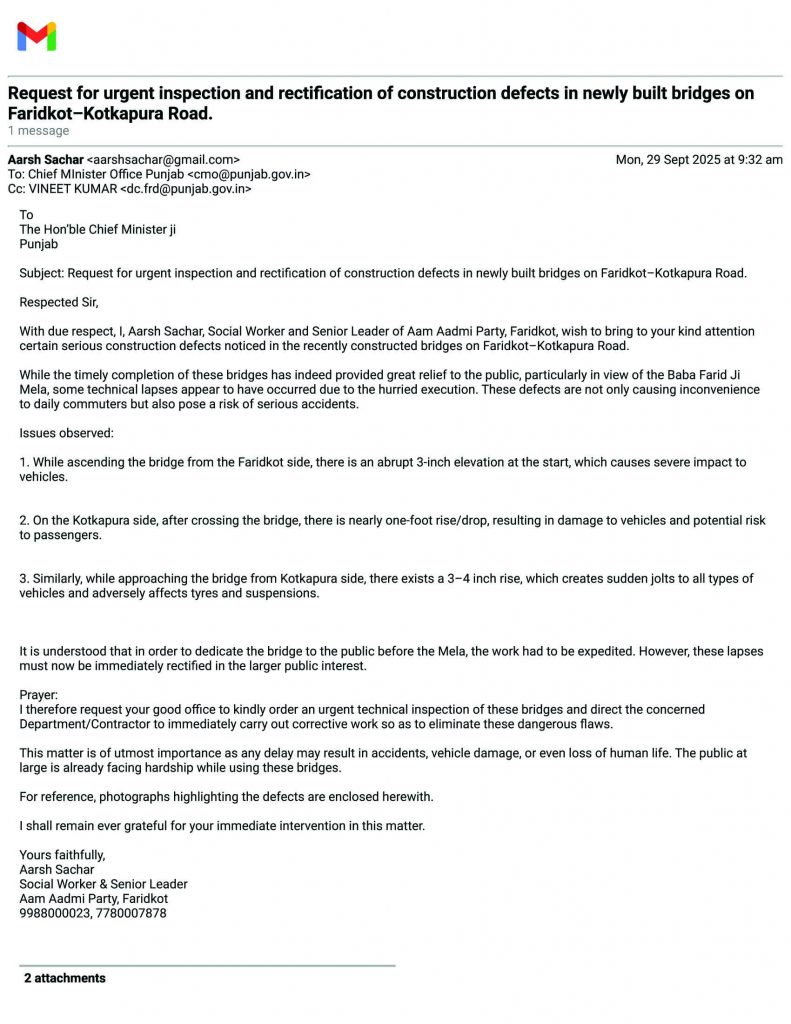 ਫਰੀਦਕੋਟ ਤੋਂ ਕੋਟਕਪੂਰਾ ਰੋਡ ’ਤੇ ਹਾਲ ਹੀ ਵਿੱਚ ਬਣੇ ਪੁਲ ਲੋਕਾਂ ਲਈ ਸਹੂਲਤ ਤਾਂ ਬਣੇ ਹਨ ਪਰ ਜਲਦੀ ਵਿੱਚ ਕੀਤੇ ਗਏ ਕੰਮ ਕਾਰਨ ਕੁਝ ਗੰਭੀਰ ਤਕਨੀਕੀ ਖਾਮੀਆਂ ਸਾਹਮਣੇ ਆ ਰਹੀਆਂ ਹਨ। ਇਹ ਖਾਮੀਆਂ ਨਾ ਸਿਰਫ਼ ਵਾਹਨਾਂ ਨੂੰ ਨੁਕਸਾਨ ਪਹੁੰਚਾ ਰਹੀਆਂ ਹਨ, ਸਗੋਂ ਕਿਸੇ ਵੀ ਸਮੇਂ ਵੱਡੇ ਹਾਦਸੇ ਦਾ ਕਾਰਨ ਵੀ ਬਣ ਸਕਦੀਆਂ ਹਨ। ਖ਼ਾਸ ਤੌਰ ’ਤੇ ਪੁਲ ਚੜ੍ਹਦਿਆਂ ਤੇ ਉਤਰਦਿਆਂ 3–4 ਇੰਚ ਤੋਂ ਲੈ ਕੇ ਇੱਕ ਫੁੱਟ ਤੱਕ ਦਾ ਅਚਾਨਕ ਚੜਾਵਾ ਅਤੇ ਥੱਲਾਵਾ ਹੈ, ਜਿਸ ਨਾਲ ਹਰ ਕਿਸਮ ਦੇ ਵਾਹਨ ਝਟਕੇ ਖਾ ਰਹੇ ਹਨ ਅਤੇ ਟਾਇਰਾਂ ਤੇ ਸਸਪੈਂਸ਼ਨ ਨੂੰ ਨੁਕਸਾਨ ਹੋ ਰਿਹਾ ਹੈ। ਅਰਸ਼ ਸੱਚਰ, ਐਕਟਿਵ ਸੋਸ਼ਲ ਵਰਕਰ ਅਤੇ ਸੀਨੀਅਰ ਲੀਡਰ (ਆਮ ਆਦਮੀ ਪਾਰਟੀ) ਫਰੀਦਕੋਟ ਨੇ ਮਾਣਯੋਗ ਮੁੱਖ ਮੰਤਰੀ ਪੰਜਾਬ ਅਤੇ ਜ਼ਿਲ੍ਹਾ ਪ੍ਰਸ਼ਾਸਨ ਨੂੰ ਬੇਨਤੀ ਕੀਤੀ ਹੈ ਕਿ ਤੁਰਤ ਤਕਨੀਕੀ ਜਾਂਚ ਕਰਵਾਈ ਜਾਵੇ ਅਤੇ ਜ਼ਿੰਮੇਵਾਰ ਵਿਭਾਗ/ਕੰਟਰੈਕਟਰ ਨੂੰ ਹੁਕਮ ਜਾਰੀ ਕਰਕੇ ਇਹ ਖਾਮੀਆਂ ਜਲਦੀ ਤੋਂ ਜਲਦੀ ਠੀਕ ਕਰਵਾਈਆਂ ਜਾਣ। ਉਨ੍ਹਾਂ ਕਿਹਾ ਕਿ ਲੋਕਾਂ ਦੀ ਜ਼ਿੰਦਗੀ ਅਤੇ ਸੁਰੱਖਿਆ ਸਭ ਤੋਂ ਵੱਡੀ ਤਰਜੀਹ ਹੋਣੀ ਚਾਹੀਦੀ ਹੈ। ਜੇਕਰ ਸਮੇਂ ਸਿਰ ਕਾਰਵਾਈ ਨਾ ਕੀਤੀ ਗਈ ਤਾਂ ਲੋਕਾਂ ਦੀ ਮੁਸ਼ਕਿਲਾਂ ਦੇ ਨਾਲ-ਨਾਲ ਵੱਡੇ ਹਾਦਸਿਆਂ ਦਾ ਵੀ ਖਤਰਾ ਬਣਿਆ ਰਹੇਗਾ।