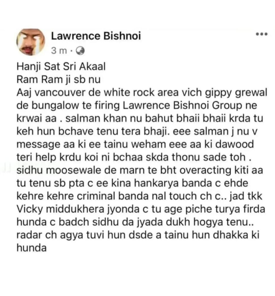 ਗਿੱਪੀ ਗਰੇਵਾਲ ਲਾਰੇਂਸ ਬਿਸ਼ਨੋਈ ਨੇ ਫੇਸਬੁੱਕ ‘ਤੇ ਇਕ ਪੋਸਟ ਰਾਹੀਂ ਦਾਅਵਾ ਕੀਤਾ ਹੈ ਕਿ ਉਸ ਨੇ ਇਹ ਗੋਲੀਬਾਰੀ ਕੀਤੀ ਹੈ। ਬਿਸ਼ਨੋਈ ਨੇ ਲਿਖਿਆ, “ਹਾਂ, ਸਤਿ ਸ਼੍ਰੀ ਅਕਾਲ ਰਾਮ ਰਾਮ ਸਬਨੂੰ, ਅੱਜ ਲਾਰੈਂਸ ਬਿਸ਼ਨੋਈ ਗਰੁੱਪ ਨੇ ਵੈਨਕੂਵਰ ਵਾਈਟ ਰੌਕ ਇਲਾਕੇ ਵਿੱਚ ਗਿੱਪੀ ਗਰੇਵਾਲ ਦੇ ਬੰਗਲੇ ‘ਤੇ ਗੋਲੀਬਾਰੀ ਕੀਤੀ ਹੈ। ਤੁਸੀਂ ਸਲਮਾਨ ਖਾਨ ਨੂੰ ਵੱਡੇ ਭਰਾ ਦੀ ਤਰ੍ਹਾਂ ਸਮਝਦੇ ਹੋ, ਮੈਨੂੰ ਕਹੋ ਕਿ ਤੁਹਾਨੂੰ, ਆਪਣੇ ਭਰਾ ਨੂੰ ਬਚਾ ਲਵਾਂ, ਅਤੇ ਇਹ ਸਲਮਾਨ ਖਾਨ ਨੂੰ ਸੰਦੇਸ਼ ਵੀ ਹੈ ਕਿ ਤੁਸੀਂ ਇਸ ਭਰਮ ਵਿੱਚ ਹੋ ਕਿ ਦਾਊਦ ਤੁਹਾਡੀ ਮਦਦ ਕਰੇਗਾ, ਤੁਹਾਨੂੰ ਸਾਡੇ ਤੋਂ ਕੋਈ ਨਹੀਂ ਬਚਾ ਸਕਦਾ। ਤੁਸੀਂ ਸਿੱਧੂ ਮੂਸੇਵਾਲਾ ਦੀ ਮੌਤ ‘ਤੇ ਬਹੁਤ ਜ਼ਿਆਦਾ ਕਾਰਵਾਈ ਕੀਤੀ ਹੈ, ਤੁਸੀਂ ਸਾਰੇ ਜਾਣਦੇ ਹੋ ਕਿ ਉਹ ਕਿੰਨਾ ਹੰਕਾਰੀ ਵਿਅਕਤੀ ਸੀ, ਉਹ ਕਿਹੜੇ ਅਪਰਾਧੀ ਲੋਕਾਂ ਦੇ ਸੰਪਰਕ ਵਿੱਚ ਸੀ।