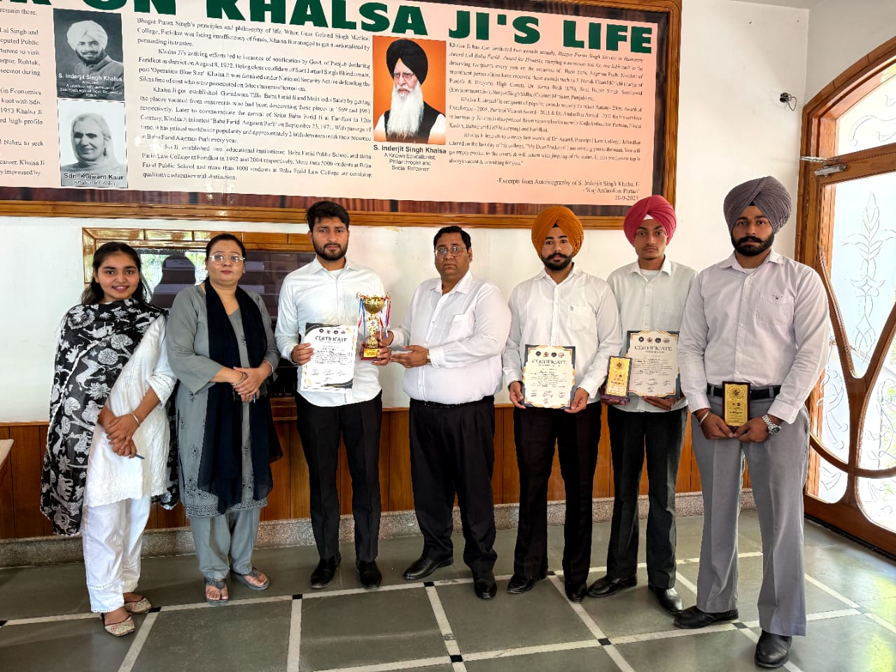 ਬਾਬਾ ਫਰੀਦ ਲਾਅ ਕਾਲਜ ਫਰੀਦਕੋਟ ਵਿਖੇ ਮਾਨਯੋਗ ਚੇਅਰਮੈਨ ਸਵ. ਇੰਦਰਜੀਤ ਸਿੰਘ ਖਾਲਸਾ ਦੀ ਅਗਾਂਹਵਧੂ ਸੋਚ ਨੂੰ ਅੱਗੇ ਵਧਾਉਂਦੇ ਹੋਏ ਸਿਮਰਜੀਤ ਸਿੰਘ ਸੇਖੋਂ ਜੀ ਦੀ ਰਹਿਨੁਮਾਈ ਅਤੇ ਪ੍ਰਿੰਸੀਪਲ ਡਾ. ਪੰਕਜ ਕੁਮਾਰ ਗਰਗ ਦੀ ਅਗਵਾਈ ਹੇਠ ਕਾਲਜ ਦੇ ਵਿਦਿਆਰਥੀ ਦਲਜੀਤ ਸਿੰਘ, ਗੁਰਕਮਲ ਸਿੰਘ, ਸਿਮਰਨਜੋਤ ਸਿੰਘ ਅਤੇ ਹਰਜਿੰਦਰ ਸਿੰਘ ਨੇ ਪੰਜਾਬ ਯੂਨੀਵਰਸਿਟੀ, ਚੰਡੀਗੜ ਵਿਖੇ ਹੋਏ ਐਮ.ਯੂ.ਐਨ ਐਂਡ ਯੂਥ ਪਾਰਲੀਮੈਂਟ ਵਿੱਚ ਹਿੱਸਾ ਲਿਆ, ਜਿਸ ਵਿੱਚੋਂ ਦਲਜੀਤ ਸਿੰਘ ਨੂੰ ਬੈਸਟ ਡੈਲੀਗੇਟ ਅਤੇ ਪਾਰਲੀਆਮੈਂਟਰੀਅਨ ਮੈਂਬਰ ਘੋਸ਼ਿਤ ਕੀਤਾ ਗਿਆ ਅਤੇ ਸਨਮਾਨ ਚਿੰਨ ਸਮੇਤ ਨਕਦ ਇਨਾਮ ਰਾਸ਼ੀ ਦਾ ਅਵਾਰਡ ਦਿੱਤਾ ਗਿਆ। ਵਿਦਿਆਰਥੀਆਂ ਦੇ ਕਾਲਜ ਪਹੁੰਚਣ ਤੇ ਪ੍ਰਿੰਸੀਪਲ ਡਾ. ਪੰਕਜ ਕੁਮਾਰ ਗਰਗ ਨੇ ਵਿਦਿਆਰਥਣੀਆਂ ਨੂੰ ਵਧਾਈਆਂ ਦਿੱਤੀਆਂ ਅਤੇ ਸਨਮਾਨਿਤ ਕੀਤਾ। ਉਹਨਾਂ ਵਿਦਿਆਰਥੀਆਂ ਨੂੰ ਉੱਚ ਅਹੁਦਿਆਂ ’ਤੇ ਪਹੁੰਚਣ ਲਈ ਸੁਭਕਾਮਨਾਵਾਂ ਵੀ ਦਿੱਤੀਆਂ। ਉਹਨਾਂ ਕਾਲਜ ਦੀ ਮੈਨੇਜਮੈਂਟ ਕਮੇਟੀ ਦਾ ਵੀ ਧੰਨਵਾਦ ਕੀਤਾ ਜੋ ਸਿਮਰਜੀਤ ਸਿੰਘ ਸੇਖੋਂ (ਚੇਅਰਮੈਨ) ਜੀ ਦੀ ਯੋਗ ਅਗਵਾਈ ਵਿੱਚ ਕਾਲਜ ਦੇ ਵਿਦਿਆਰਥੀਆਂ ਨੂੰ ਹਰ ਤਰਾਂ ਦੀ ਸਹੂਲਤ ਮੁਹੱਇਆ ਕਰਵਾ ਰਹੀ ਹੈ। ਉਹਨਾਂ ਵਿਦਿਆਰਥੀਆਂ ਦੀ ਤਿਆਰੀ ਕਰਵਾਉਣ ਵਾਲੇ ਮਿਸ ਪਵਨਪ੍ਰੀਤ ਕੌਰ (ਅਸਿਸਟੈਂਟ ਪ੍ਰੋਫੈਸਰ) ਨੂੰ ਵੀ ਵਧਾਈਆਂ ਦਿੱਤੀਆਂ। ਇਸ ਮੌਕੇ ਡਾ. ਨਵਜੋਤ ਕੌਰ (ਇੰਚਾਰਜ ਅਕੈਡਮਿਕ) ਵੀ ਮੌਜੂਦ ਰਹੇ।