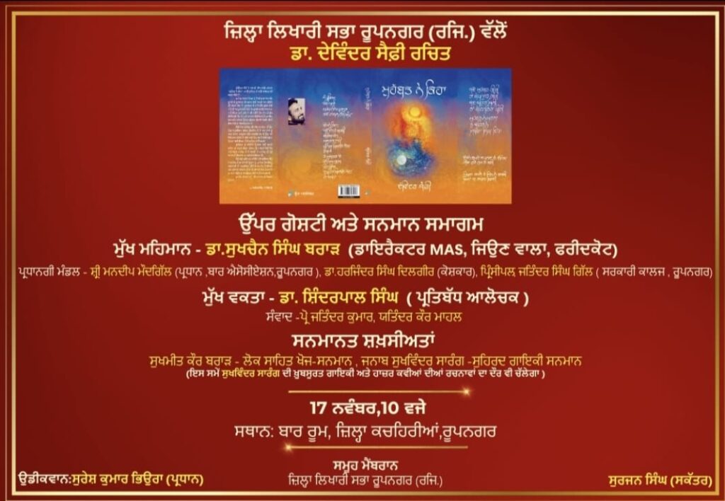 ਇਲਾਕੇ ਦੇ ਨਾਮਵਰ ਪੰਜਾਬੀ ਸ਼ਾਇਰ ਅਤੇ ਚਿੰਤਕ ਡਾ. ਦੇਵਿੰਦਰ ਸੈਫ਼ੀ ਦੀ ਨਵੀਂ ਪੁਸਤਕ “ਮੁਹੱਬਤ ਨੇ ਕਿਹਾ” ਉੱਪਰ ਗੰਭੀਰ ਚਰਚਾ 17 ਨਵੰਬਰ ਨੂੰ ਹੋਵੇਗੀ। ਇਸ ਚਰਚਾ ਦਾ ਪ੍ਰਬੰਧ ਜ਼ਿਲ੍ਹਾ ਲਿਖਾਰੀ ਸਭਾ, ਰੂਪਨਗਰ ( ਰਜਿ.) ਵੱਲੋਂ ਬਾਰ ਰੂਮ , ਜ਼ਿਲ੍ਹਾ ਕਚਿਹਰੀਆਂ, ਰੂਪਨਗਰ ਵਿੱਚ ਸਵੇਰ ਦੇ ਵਕਤ 10 ਵਜੇ ਕੀਤਾ ਜਾਵੇਗਾ। ਸਭਾ ਦੇ ਪ੍ਰਧਾਨ ਐਡਵੋਕੇਟ ਸੁਰੇਸ਼ ਕੁਮਾਰ ਭਿਓਰਾ ਅਤੇ ਸਕੱਤਰ ਸ.ਸੁਰਜਨ ਸਿੰਘ ਨੇ ਦੱਸਿਆ ਕਿ ਇਸ ਪੁਸਤਕ ਉੱਪਰ ਪ੍ਰਸਿੱਧ ਆਲੋਚਕ ਡਾ. ਸ਼ਿੰਦਰਪਾਲ ਸਿੰਘ ਪਰਚਾ ਪੇਸ਼ ਕਰਨਗੇ। ਪ੍ਰੋ.ਜਤਿੰਦਰ ਅਤੇ ਸਾਹਿਤਕਾਰਾ ਯਾਤਿੰਦਰ ਕੌਰ ਮਾਹਲ ਸੰਵਾਦ ਵਿੱਚ ਹਿੱਸਾ ਲੈਣਗੇ। ਪ੍ਰਧਾਨਗੀ ਮੰਡਲ ਵਿੱਚ ਬਾਰ ਕੌਂਸਲ ਦੇ ਪ੍ਰਧਾਨ ਸ਼੍ਰੀ ਮਨਦੀਪ ਮੌਦਗਿਲ, ਪ੍ਰਿੰਸੀਪਲ਼ ਜਤਿੰਦਰ ਸਿੰਘ ਗਿੱਲ ਅਤੇ ਕੋਸ਼ਕਾਰੀ ਦੇ ਪ੍ਰਸਿੱਧ ਹਸਤਾਖ਼ਰ ਡਾ.ਹਰਜਿੰਦਰ ਸਿੰਘ ਦਿਲਗੀਰ ਸ਼ਾਮਲ ਹੋਣਗੇ। ਮੁੱਖ ਮਹਿਮਾਨ ਵਜੋਂ ਉੱਘੇ ਸਿੱਖਿਆ ਸ਼ਾਸਤਰੀ ਅਤੇ ਸਮਾਜ ਸੇਵੀ ਡਾ. ਸੁਖਚੈਨ ਸਿੰਘ ਬਰਾੜ ਸ਼ਿਰਕਤ ਕਰਨਗੇ। ਇਸ ਪ੍ਰੋਗਰਾਮ ਵਿੱਚ ਉੱਘੇ ਗਾਇਕ ਸੁਖਵਿੰਦਰ ਸਾਰੰਗ ਦੀ ਸੰਗੀਤਕ ਪੇਸ਼ਕਾਰੀ ਵੀ ਹੋਵੇਗੀ। ਇਸ ਮੌਕੇ ਉੱਘੀਆਂ ਸ਼ਖ਼ਸੀਅਤਾਂ ਦਾ ਸਨਮਾਨ ਵੀ ਕੀਤਾ ਜਾਵੇਗਾ।