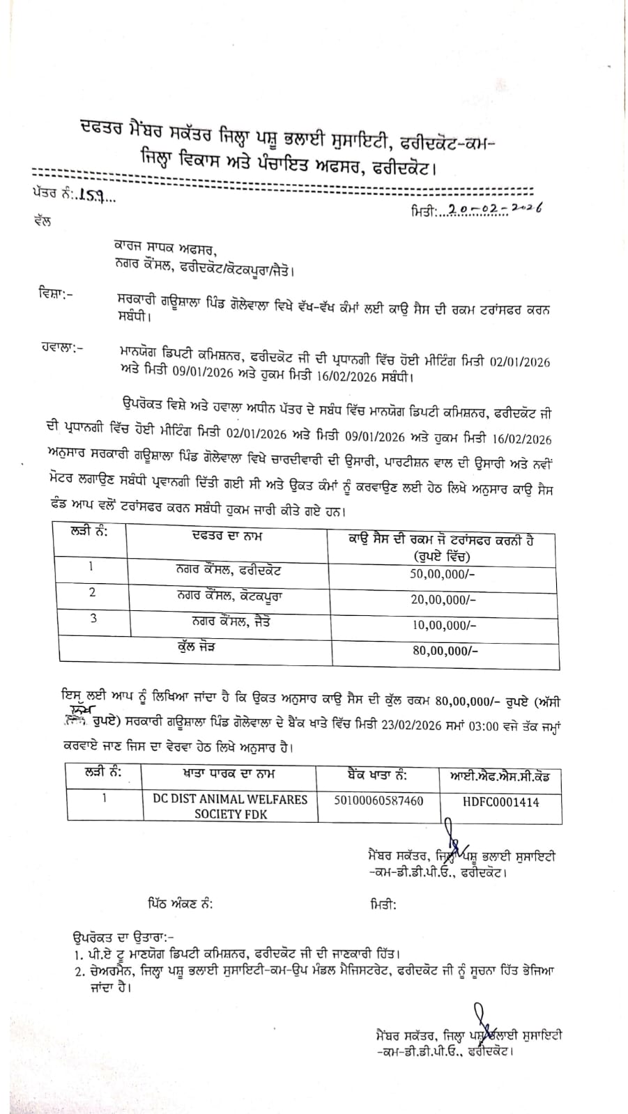 ਪਿੰਡ ਗੋਲੇਵਾਲਾ ਸਥਿੱਤ ਜ਼ਿਲ੍ਹੇ ਦੀ ਇਕਲੌਤੀ ਸਰਕਾਰੀ ਗਊਸ਼ਾਲਾ ਵਿੱਚ ਫੰਡਾਂ ਦੀ ਕਮੀ ਅਤੇ ਪ੍ਰਬੰਧਕੀ ਖਾਮੀਆਂ ਕਾਰਨ ਗਉਧਨ ਦੀ ਖਰਾਬ ਹੋ ਰਹੀ ਹਾਲਤ ਦਾ ਮਾਮਲਾ ਉਠਾਏ ਜਾਣ ਤੋਂ ਬਾਅਦ ਹੁਣ ਪ੍ਰਸ਼ਾਸਨ ਵੱਲੋਂ ਢੁਕਵੇਂ ਕਦਮ ਚੁੱਕੇ ਗਏ ਹਨ। ਸਮਾਜਸੇਵੀ ਅਤੇ ਆਮ ਆਦਮੀ ਪਾਰਟੀ ਦੇ ਸੀਨੀਅਰ ਆਗੂ ਅਰਸ਼ ਸਚਰ ਵੱਲੋਂ ਇਸ ਗੰਭੀਰ ਮਸਲੇ ਨੂੰ ਲਗਾਤਾਰ ਉਭਾਰਿਆ ਗਿਆ ਅਤੇ ਮਾਣਯੋਗ ਮੁੱਖ ਮੰਤਰੀ ਪੰਜਾਬ ਭਗਵੰਤ ਮਾਨ ਨੂੰ ਲਿਖਤੀ ਪੱਤਰ ਭੇਜ ਕੇ ਦਖ਼ਲਅੰਦਾਜ਼ੀ ਦੀ ਮੰਗ ਕੀਤੀ ਗਈ। ਇਸ ਉਪਰੰਤ ਮੁੱਖ ਮੰਤਰੀ ਦਫ਼ਤਰ ਵੱਲੋਂ ਜ਼ਿਲ੍ਹਾ ਪ੍ਰਸ਼ਾਸਨ ਨੂੰ ਤੁਰਤ ਕਾਰਵਾਈ ਕਰਨ ਦੇ ਨਿਰਦੇਸ਼ ਜਾਰੀ ਕੀਤੇ ਗਏ। ਹਾਲ ਹੀ ਵਿੱਚ ਹੋਈਆਂ ਮੀਟਿੰਗਾਂ ਤੋਂ ਬਾਅਦ ਜ਼ਿਲ੍ਹਾ ਪਸ਼ੂ ਭਲਾਈ ਕਮੇਟੀ ਵੱਲੋਂ ਜ਼ਿਲ੍ਹੇ ਦੀਆਂ ਤਿੰਨਾਂ ਨਗਰ ਕੌਂਸਲਾਂ ਨੂੰ ਗਊ ਸੈਸ ਤਹਿਤ ਇਕੱਠੀ ਕੀਤੀ ਗਈ ਰਕਮ ਵਿੱਚੋਂ ਕੁੱਲ 80 ਲੱਖ ਰੁਪਏ ਸਰਕਾਰੀ ਗਊਸ਼ਾਲਾ ਦੇ ਖਾਤੇ ਵਿੱਚ ਜਮਾਂ ਕਰਵਾਉਣ ਦੇ ਹੁਕਮ ਜਾਰੀ ਕੀਤੇ ਗਏ ਹਨ, ਤਾਂ ਜੋ ਗਊਸ਼ਾਲਾ ਦੀ ਹਾਲਤ ਵਿੱਚ ਢੁਕਵਾਂ ਸੁਧਾਰ ਲਿਆਂਦਾ ਜਾ ਸਕੇ। ਅਰਸ਼ ਸਚਰ ਵੱਲੋਂ ਉਠਾਏ ਗਏ ਮੁੱਖ ਸੁਝਾਵ ਗਊਸ਼ਾਲਾ ਵਿੱਚ ਪਸ਼ੂਆਂ ਦੀ ਤਿਮਾਹੀ ਗਿਣਤੀ ਅਤੇ ਟੈਗਿੰਗ ਪ੍ਰਣਾਲੀ ਲਾਗੂ ਕੀਤੀ ਜਾਵੇ, ਹਰ ਮਹੀਨੇ ਟੀਕਾਕਰਣ ਕੈਂਪ ਲਾਏ ਜਾਣ, ਬਿਮਾਰ ਪਸ਼ੂਆਂ ਲਈ ਵੱਖਰਾ ਇਲਾਜ ਸ਼ੈਡ ਬਣਾਇਆ ਜਾਵੇ, ਨਿਯਮਿਤ ਸਫ਼ਾਈ ਅਤੇ ਕੂੜਾ ਉਠਾਉਣ ਦੀ ਪੱਕੀ ਵਿਵਸਥਾ ਕੀਤੀ ਜਾਵੇ, ਗੋਬਰ ਇਕੱਠਾ ਕਰਕੇ ਕੰਪੋਸਟ ਯੂਨਿਟ ਸਥਾਪਿਤ ਕੀਤੀ ਜਾਵੇ, ਗਊਸ਼ਾਲਾ ਦੀ ਜ਼ਮੀਨ ਅਤੇ ਰਿਕਾਰਡ ਦੀ ਜਾਂਚ ਕੀਤੀ ਜਾਵੇ ਅਤੇ ਹਰੇ ਚਾਰੇ ਦੀ ਨਿਯਮਿਤ ਸਪਲਾਈ ਯਕੀਨੀ ਬਣਾਈ ਜਾਵੇ। ਆਰ.ਟੀ.ਆਈ. ਰਾਹੀਂ ਸਾਹਮਣੇ ਆਏ ਤੱਥ ਆਰ.ਟੀ.ਆਈ. ਰਾਹੀਂ ਪ੍ਰਾਪਤ ਜਾਣਕਾਰੀ ਅਨੁਸਾਰ ਸਿਰਫ਼ ਨਗਰ ਕੌਂਸਲ ਫਰੀਦਕੋਟ ਵੱਲੋ 1 ਅਪ੍ਰੈਲ 2021 ਤੋਂ 31 ਮਾਰਚ 2022 ਤੱਕ 5,78,600 ਰੁਪਏ, 1 ਅਪ੍ਰੈਲ 2022 ਤੋਂ 31 ਮਾਰਚ 2023 ਤੱਕ 6,30,600 ਰੁਪਏ, 1 ਅਪ੍ਰੈਲ 2023 ਤੋਂ 31 ਮਾਰਚ 2024 ਤੱਕ 6,24,000 ਰੁਪਏ ਗਊਸੈਸ ਦੇ ਨਾਮ ’ਤੇ ਇਕੱਠੇ ਕੀਤੇ ਗਏ ਸਨ। ਇਸਦੇ ਬਾਵਜੂਦ ਗਊਸ਼ਾਲਾ ਵਿੱਚ ਸਟਾਫ ਦੀ ਘਾਟ ਅਤੇ ਹਰੇ ਚਾਰੇ ਦੀ ਕਮੀ ਕਾਰਨ ਗਊਧਨ ਦੀ ਹਾਲਤ ਚਿੰਤਾਜਨਕ ਬਣੀ ਰਹੀ। ਪਸ਼ੂ ਪਾਲਣ ਵਿਭਾਗ ਦੇ ਡਿਪਟੀ ਡਾਇਰੈਕਟਰ ਵੱਲੋਂ 2 ਜਨਵਰੀ 2026 ਨੂੰ ਦਿੱਤੇ ਗਏ ਜਵਾਬ ਵਿੱਚ ਵੀ ਮੰਨਿਆ ਗਿਆ ਕਿ ਸਟਾਫ ਦੀ ਘਾਟ ਅਤੇ ਹਰੇ ਚਾਰੇ ਦੀ ਕਮੀ ਪਸ਼ੂਆਂ ਦੀ ਮੌਤ ਦਾ ਇੱਕ ਮੁੱਖ ਕਾਰਣ ਸੀ, ਜਿਸ ਕਾਰਨ ਪਸ਼ੂਆਂ ਨੂੰ ਕੇਵਲ ਸੁੱਕੀ ਤੂੜੀ ਤੇ ਨਿਰਭਰ ਰਹਿਣਾ ਪੈਂਦਾ ਸੀ। ਪ੍ਰਸ਼ਾਸਨਕ ਹੁਕਮ 20 ਫ਼ਰਵਰੀ ਨੂੰ ਜ਼ਿਲ੍ਹਾ ਪਸ਼ੂ ਭਲਾਈ ਸੋਸਾਇਟੀ-ਕਮ-ਜ਼ਿਲ੍ਹਾ ਵਿਕਾਸ ਅਤੇ ਪੰਚਾਇਤ ਅਧਿਕਾਰੀ ਵੱਲੋਂ ਨਗਰ ਕੌਂਸਲ ਫਰੀਦਕੋਟ, ਕੋਟਕਪੂਰਾ ਅਤੇ ਜੈਤੋ ਨੂੰ ਕੁੱਲ 80 ਲੱਖ ਗਊਸ਼ਾਲਾ ਦੇ ਖਾਤੇ ਵਿੱਚ ਜਮਾਂ ਕਰਵਾਉਣ ਦੇ ਨਿਰਦੇਸ਼ ਜਾਰੀ ਕੀਤੇ ਗਏ ਹਨ, ਤਾਂ ਜੋ ਗੋਲੇਵਾਲਾ ਸਥਿੱਤ ਸਰਕਾਰੀ ਗਊਸ਼ਾਲਾ ਦੀ ਹਾਲਤ ਵਿੱਚ ਢੁੱਕਵਾਂ ਸੁਧਾਰ ਲਿਆਂਦਾ ਜਾ ਸਕੇ। ਅਰਸ਼ ਸਚਰ ਨੇ ਕਿਹਾ ਕਿ ਇਹ ਫੈਸਲਾ ਸਿਰਫ਼ ਰਕਮ ਜਾਰੀ ਹੋਣ ਤੱਕ ਸੀਮਿਤ ਨਹੀਂ, ਸਗੋਂ ਜਵਾਬਦੇਹੀ ਅਤੇ ਗਉ-ਸੇਵਾ ਪ੍ਰਤੀ ਸਰਕਾਰ ਦੀ ਵਚਨਬੱਧਤਾ ਦਾ ਪ੍ਰਤੀਕ ਹੈ। ਉਨ੍ਹਾਂ ਮਾਣਯੋਗ ਮੁੱਖ ਮੰਤਰੀ ਪੰਜਾਬ ਅਤੇ ਜ਼ਿਲ੍ਹਾ ਪ੍ਰਸ਼ਾਸਨ ਦਾ ਧੰਨਵਾਦ ਕਰਦਿਆਂ ਕਿਹਾ ਕਿ ਪਾਰਦਰਸ਼ੀ ਪ੍ਰਬੰਧਨ ਅਤੇ ਨਿਰੰਤਰ ਨਿਗਰਾਨੀ ਨਾਲ ਗੋਲੇਵਾਲਾ ਸਰਕਾਰੀ ਗਊਸ਼ਾਲਾ ਨੂੰ ਇੱਕ ਮਾਡਲ ਗਊਸ਼ਾਲਾ ਵਜੋਂ ਵਿਕਸਿਤ ਕੀਤਾ ਜਾਵੇਗਾ।
