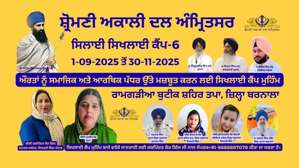 ਰਸ਼ਪਿੰਦਰ ਕੌਰ ਗਿੱਲ-ਸ਼੍ਰੋਮਣੀ ਅਕਾਲੀ ਦਲ ਅੰਮ੍ਰਿਤਸਰ ਔਰਤਾਂ ਨੂੰ ਸਮਾਜਿਕ ਅਤੇ ਆਰਥਿਕ ਪੱਧਰ ਉੱਤੇ ਮਜ਼ਬੂਤ ਕਰਨ ਲਈ ਪੰਜਾਬ ਦੇ ਹਰ ਜ਼ਿਲ੍ਹੇ ਵਿੱਚ ਤਿੰਨ ਮਹੀਨੇ ਦੇ ਸਿਖਾਲ਼ੀ ਕੈਂਪਾਂ ਦੀ ਮੁਹਿੰਮ ਚਲਾ ਰਿਹਾ ਹੈ। ਇਸੇ ਤਹਿਤ ਸ਼੍ਰੋਮਣੀ ਅਕਾਲੀ ਦਲ ਅੰਮ੍ਰਿਤਸਰ ਵੱਲੋਂ ਰਾਮਗੜੀਆ ਬੁਟੀਕ ਸ਼ਹਿਰ ਤਪਾ ਜ਼ਿਲਾ ਬਰਨਾਲਾ ਵਿਖੇ ਸਿਲਾਈ ਕੈਂਪ ਦੀ ਕੀਤੀ ਗਈ ਸ਼ੁਰੂਆਤ। ਇਸ ਕੈਂਪ ਦੀ ਟ੍ਰੇਨਰ ਬੀਬੀ ਮਨਜੀਤ ਕੌਰ ਜੀ ਹਨ। ਇਸ ਕੈਂਪ ਦੇ ਉਦਘਾਟਨ ਸਮੇਂ ਸ਼੍ਰੋਮਣੀ ਅਕਾਲੀ ਦਲ ਅੰਮ੍ਰਿਤਸਰ ਦੀ ਬਰਨਾਲਾ ਦੀ ਜਥੇਬੰਦੀ ਦੇ ਬੀਬੀ ਵੀਰਪਾਲ ਕੌਰ ਜੀ ਪ੍ਰਧਾਨ ਸ਼ਹਿਰ ਤਪਾ ਇਸਤਰੀ ਵਿੰਗ, ਬੀਬੀ ਭੁਪਿੰਦਰਜੀਤ ਕੌਰ ਬਿਰਦੀ ਜੀ ਜੱਥੇਬੰਦਕ ਸਕੱਤਰ ਇਸਤਰੀ ਵਿੰਗ ਜ਼ਿਲਾ ਬਰਨਾਲਾ, ਸ. ਦਰਸ਼ਨ ਸਿੰਘ ਮੰਡੇਰ ਜੀ ਪ੍ਰਧਾਨ ਜ਼ਿਲਾ ਬਰਨਾਲਾ, ਅਵਤਾਰ ਸਿੰਘ ਜੀ ਪ੍ਰਧਾਨ ਮੁਲਾਜ਼ਮ ਵਿੰਗ ਜ਼ਿਲਾ ਬਰਨਾਲਾ, ਮਹਿਕਪ੍ਰੀਤ ਸਿੰਘ ਜੀ ਯੂਥ ਵਿੰਗ ਮੈਂਬਰ, ਕੁਲਦੀਪ ਸਿੰਘ ਜੀ, ਲਖਵੀਰ ਸਿੰਘ ਜੀ ਅਤੇ ਮਨਪ੍ਰੀਤ ਸਿੰਘ ਜੀ ਮੌਜੂਦ ਸਨ। ਪਾਰਟੀ ਦੇ ਆਗੂਆਂ ਨੇ ਸਿਖਲਾਈ ਲੈਣ ਆਈਆਂ ਬੱਚੀਆਂ ਨੂੰ ਹੱਥੀਂ ਕੰਮ ਸਿੱਖ ਕੇ ਆਪਣੇ ਆਪ ਨੂੰ ਮਾਨਸਿਕ ਅਤੇ ਆਰਥਿਕ ਮਜ਼ਬੂਤ ਹੋਣ ਲਈ ਪ੍ਰੇਰਿਤ ਕੀਤਾ। ਇੰਨਾਂ ਸਿਖਲਾਈ ਕੈਂਪਾਂ ਰਾਹੀਂ ਤਿੰਨ ਮਹੀਨੇ ਸਿਲਾਈ ਅਤੇ ਕਢਾਈ ਦੀ ਸਿਖਲਾਈ ਦਿੱਤੀ ਜਾਏਗੀ। ਤਿੰਨ ਮਹੀਨੇ ਦੇ ਇਸ ਕੈਂਪ ਦੇ ਅੰਤ ਉੱਤੇ ਸ਼੍ਰੋਮਣੀ ਅਕਾਲੀ ਦਲ ਅੰਮ੍ਰਿਤਸਰ ਵੱਲੋਂ ਤਿੰਨ ਮਹੀਨੇ ਦਾ ਕੋਰਸ ਕਰਣ ਵਾਲੀਆਂ ਬੀਬੀਆਂ ਨੂੰ ਅਤੇ ਕੈਂਪ ਚਲਾਉਣ ਵਾਲੀ ਬੀਬੀ ਨੂੰ ਸ਼੍ਰੋਮਣੀ ਅਕਾਲੀ ਦਲ ਅੰਮ੍ਰਿਤਸਰ ਵੱਲੋਂ certificate ਵੀ ਦਿੱਤਾ ਜਾਏਗਾ। ਪਾਰਟੀ ਵੱਲੋਂ ਲਗਾਏ ਜਾ ਰਹੇ ਇੰਨਾਂ ਸਾਰੇ ਕੈਂਪਾਂ ਦੀ ਜ਼ਿੰਮੇਵਾਰੀ ਰਸ਼ਪਿੰਦਰ ਕੌਰ ਗਿੱਲ ਜਨਰਲ ਸਕੱਤਰ ਪੰਜਾਬ ਇਸਤਰੀ ਵਿੰਗ ਦੀ ਰਹੇਗੀ। ਸਿਖਲਾਈ ਕੈਂਪਾਂ ਬਾਰੇ ਵਧੇਰੇ ਜਾਣਕਾਰੀ ਲਈ ਰਸ਼ਪਿੰਦਰ ਕੌਰ ਗਿੱਲ ਜੀ ਨਾਲ ਸੰਪਰਕ ਕੀਤਾ ਜਾ ਸਕਦਾ ਹੈ।