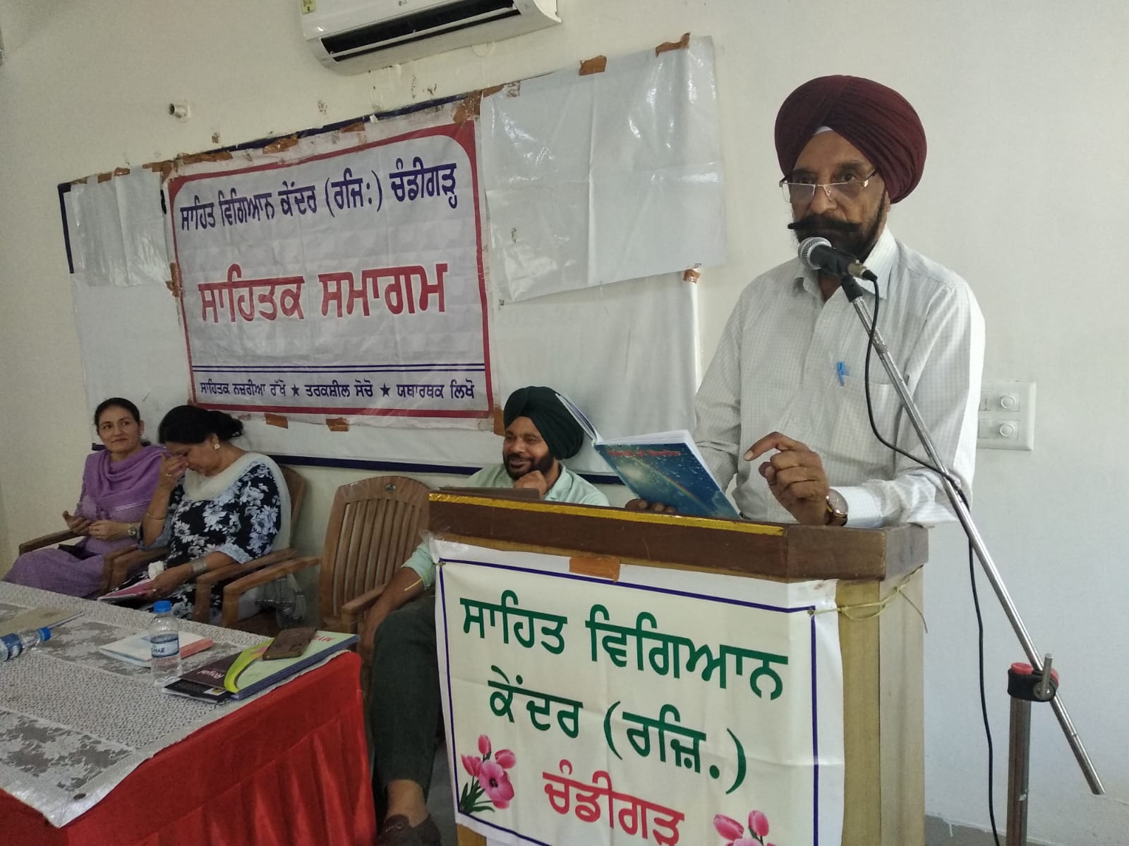 ਸਾਹਿਤ ਵਿਗਿਆਨ ਕੇਂਦਰ ਚੰਡੀਗੜ੍ਹ ਦੀ ਮਾਸਿਕ ਇਕੱਤਰਤਾ ਰੋਟਰੀ ਭਵਨ ਮੋਹਾਲੀ ਵਿਖੇ ਹੋਈ ਜਿਸ ਦੇ ਪ੍ਰਧਾਨਗੀ ਮੰਡਲ ਵਿਚ ਡਾ: ਰਜਿੰਦਰ ਰੇਨੂੰ, ਮਨਦੀਪ ਕੌਰ ਸੋਹਲ, ਗੁਰਦਰਸ਼ਨ ਸਿੰਘ ਮਾਵੀ ਅਤੇ ਭਰਪੂਰ ਸਿੰਘ ਸ਼ਾਮਲ ਸਨ।ਕੇੰਦਰ ਦੇ ਪ੍ਰਧਾਨ ਗੁਰਦਰਸ਼ਨ ਸਿੰਘ ਮਾਵੀ ਨੇ ਸਭ ਨੂੰ “ਜੀ ਆਇਆਂ” ਆਖਿਆ ਅਤੇ ਕੇਂਦਰ ਦੀਆਂ ਨੇੜ ਭਵਿੱਖੀ ਯੋਜਨਾਵਾਂ ਬਾਰੇ ਦਸਿਆ। ਕਵੀ-ਦਰਬਾਰ ਵਿਚ ਸਭ ਤੋਂ ਪਹਿਲਾਂ ਸੁਧੀਰ ਮੋਤੀ ਨੇ ਹਿੰਦੀ ਵਿਚ ਗਜਲ ਸੁਣਾਈ।ਮਲਕੀਤ ਸਿੰਘ ਨਾਗਰਾ ,ਸਵਰਨਜੀਤ ਸਿੰਘ,ਬਲਵਿੰਦਰ ਸਿੰਘ ਢਿੱਲੋਂ,ਲਾਭ ਸਿੰਘ ਲਹਿਲੀ, ਭਰਪੂਰ ਸਿੰਘ ਨੇ ਪੂਰੇ ਜੋਸ਼ ਨਾਲ ਵੱਖੋ ਵੱਖ ਵੰਨਗੀ ਦੇ ਗੀਤ ਸੁਣਾਏ।ਰਾਜਵਿੰਦਰ ਸਿੰਘ ਗੱਡੂ,ਸਤਿੰਦਰ ਸਿੰਘ ਬੇਦੀ,ਮਨਜੀਤ ਪਾਲ ਸਿੰਘ, ਗੁਰਚਰਨ ਸਿੰਘ,ਹਰਜੀਤ ਸਿੰਘ, ਬਲਕਾਰ ਸਿੰਘ ਸਿੱਧੂ, ਗੁਰਦਰਸ਼ਨ ਸਿੰਘ ਮਾਵੀ, ਮਨਦੀਪ ਕੌਰ ਸੋਹਲ,ਰਜਿੰਦਰ ਰੇਨੂੰ ਨੇ ਸਮਾਜਿਕ ਸਰੋਕਾਰ ਵਾਲੀਆਂ ਕਵਿਤਾਵਾਂ ਪੇਸ਼ ਕੀਤੀਆਂ । ਪਿੰਜੌਰ ਤੋਂ ਪਹੁੰਚੇ ਗੁਰਦਾਸ ਸਿੰਘ ਦਾਸ ਨੇ ਤੂੰਬੀ ਨਾਲ ਪੰਜਾਬ ਬਾਰੇ ਖੂਬਸੂਰਤ ਗੀਤ ਸੁਣਾ ਕੇ ਰੰਗ ਬੰਨ੍ਹਿਆ। ਪ੍ਰਲਾਦ ਸਿੰਘ ਨੇ ਸਾਧੂ ਸਿੰਘ ਹਮਦਰਦ ਅਤੇ ਸੁਖਦੇਵ ਸਿੰਘ ਕਾਹਲੋਂ ਨੇ ਸ਼ਿਵ ਕੁਮਾਰ ਬਟਾਲਵੀ ਦੀ ਗਜ਼ਲ ਅਤੇ ਸਰਬਜੀਤ ਸਿੰਘ ਪੱਡਾ ਨੇ ਬੁਲ੍ਹੇ ਸ਼ਾਹ ਦਾ ਕਲਾਮ ਤਰੰਨੁਮ ਵਿਚ ਪੇਸ਼ ਕੀਤੇ।ਰਜਿੰਦਰ ਰੇਨੂੰ ਨੇ ਪ੍ਰਧਾਨਗੀ ਭਾਸ਼ਣ ਦਿੰਦੇ ਪ੍ਰੋਗਰਾਮ ਦੀ ਸਰਾਹਨਾ ਕੀਤੀ ਅਤੇ ਕਿਹਾ ਕਿ ਅਜਿਹੇ ਪ੍ਰੋਗਰਾਮ ਕਵੀਆਂ ਨੂੰ ਮੰਚ ਪ੍ਰਦਾਨ ਕਰਦੇ ਹਨ ਅਤੇ ਅੱਗੇ ਵਧਾਉਣ ਵਿਚ ਸਹਾਈ ਹੁੰਦੇ ਹਨ।ਗੁਰਦਰਸ਼ਨ ਸਿੰਘ ਮਾਵੀ ਨੇ ਸਭ ਦਾ ਧੰਨਵਾਦ ਕੀਤਾ।ਮੰਚ ਸੰਚਾਲਨ ਭਰਪੂਰ ਸਿੰਘ ਨੇ ਬੜੇ ਸੋਹਜਮਈ ਢੰਗ ਨਾਲ ਕੀਤਾ।ਚਾਹ ਪਾਣੀ ਦੀ ਸੇਵਾ ਦਰਸ਼ਨ ਸਿੰਘ ਸਿੱਧੂ ਨੇ ਆਪਣੇ ਪੋਤੇ ਦੇ ਜਨਮ ਦੀ ਖੁਸ਼ੀ ਵਿਚ ਕੀਤੀ।