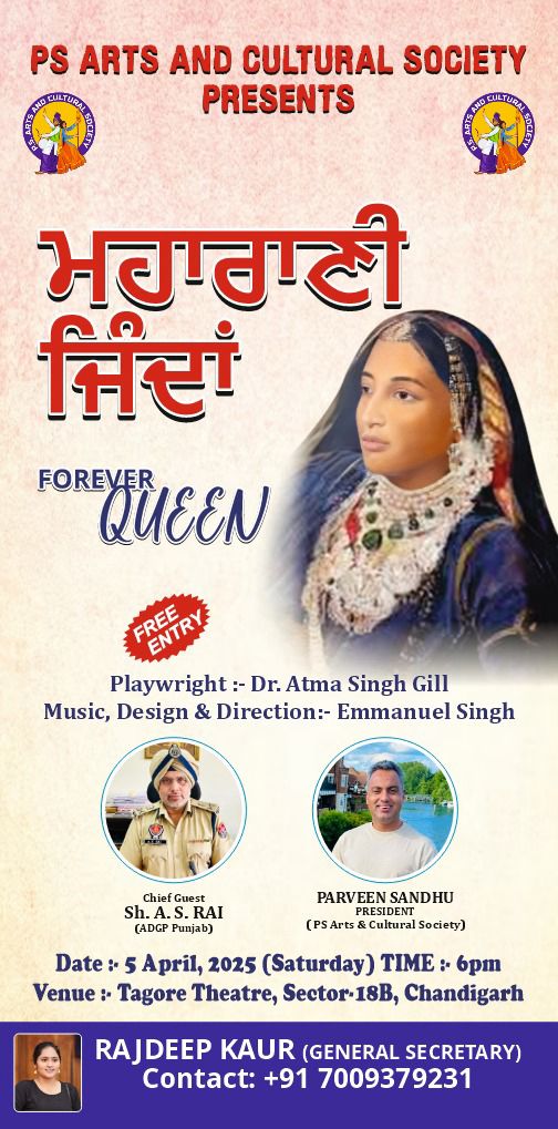 ਨਾਟਕ ਬਾਰੇ : Forever Queen ਮਹਾਰਾਣੀ ਜਿੰਦਾਂ ਨਾਟਕ ਦਾ ਮੰਤਵ ਅੱਜ ਦੀ ਨਵੀਂ ਪੀੜ੍ਹੀ ਨੂੰ ਪੰਜਾਬ ਦੇ ਉਸ ਸੁਨਹਿਰੀ ਦੌਰ ਨਾਲ ਜਾਣੂ ਕਰਵਾਉਣਾ ਹੈ ਜਿਸ ਨੂੰ ਖਾਲਸਾ ਰਾਜ ਜਾਂ ਸ਼ੇਰੇ ਪੰਜਾਬ ਮਹਾਰਾਜਾ ਰਣਜੀਤ ਸਿੰਘ ਦੇ ਨਾਂ ਨਾਲ ਜਾਣਿਆ ਜਾਂਦਾ ਹੈ। ਇਹ ਖਿੱਤਾ ਸ਼ੁਰੂ ਤੋਂ ਹੀ ਜੰਗਾਂ-ਯੁੱਧਾਂ ਦਾ ਅਖਾੜਾ ਰਿਹਾ। ਘੁੱਗ ਵੱਸਦੇ ਪੰਜਾਬ ਅੰਦਰ ਕਦੇ ਵੀ ਸਦੀਵੀ ਸਥਿਰਤਾ ਨਹੀਂ ਰਹੀ। ਸ਼ੇਰੇ ਪੰਜਾਬ ਮਹਾਰਾਜਾ ਰਣਜੀਤ ਸਿੰਘ ਦੇ ਰੂਪ ਵਿੱਚ ਉਹ ਸੂਰਜ ਪੰਜਾਬੀਆਂ ਲਈ ਚੜਿਆ ਜਿਸਦਾ ਨਿੱਘ ਪੰਜਾਬੀਆਂ ਨੇ ਅੱਧੀ ਸਦੀ ਤੱਕ ਮਾਣਿਆ। ਪੰਜਾਬ ਨਾ ਸ਼ੇਰੇ ਪੰਜਾਬ ਮਹਾਰਾਜਾ ਰਣਜੀਤ ਸਿੰਘ ਤੋਂ ਪਹਿਲਾਂ ਅਤੇ ਨਾ ਉਸ ਤੋਂ ਬਾਦ ਕਦੇ ਇੰਨਾ ਖੁਸ਼ਹਾਲ ਅਬਾਦ ਤੇ ਸਥਿਰ ਰਿਹਾ ਜਿੰਨਾ ਕਿ ਉਸ ਵੇਲੇ ਸੀ। ਤਾਰੀਖ ਗਵਾਹ ਹੈ ਜਿੰਨੇ ਵੀ ਹਮਲਾਵਰ ਹਿੰਦੁਸਤਾਨ ਦੀ ਧਰਤੀ ਤੇ ਆਏ ਸਾਰੇ ਪੰਜਾਬ ਦੇ ਰਸਤਿਉਂ। ਮਹਾਰਾਜਾ ਰਣਜੀਤ ਸਿੰਘ ਉਹ ਪਹਿਲਾ ਪੰਜਾਬੀ ਸੂਰਮਾ ਹੈ ਜਿਸ ਦੇ ਲੋਹੇ ਦੀ ਸ਼ਾਨ ਨੇ ਦੱਰਾ-ਏ-ਖੈਬਰ ਵੱਲੋਂ ਆਉਂਦੇ ਹਮਲਾਵਰਾਂ ਦੇ ਰਾਹ ਹਮੇਸ਼ਾਂ ਵਾਸਤੇ ਬੰਦ ਕਰ ਦਿੱਤੇ। ਮਹਾਰਾਜਾ ਰਣਜੀਤ ਸਿੰਘ ਜਿਸਨੂੰ ਸ਼ੇਰ-ਏ-ਪੰਜਾਬ ਵਜੋਂ ਜਾਣਿਆ ਜਾਂਦਾ ਹੈ, ਪੰਜ ਦਰਿਆਵਾਂ ਦੀ ਧਰਤੀ ਉੱਤੇ ਰਾਜ ਕਰਨ ਵਾਲਾ ਪਹਿਲਾ ਮੂਲ ਪੰਜਾਬੀ ਹੈ। ਇੱਕ ਦੁਰਲੱਭ ਭੂ-ਰਣਨੀਤਕ ਦ੍ਰਿਸ਼ਟੀ ਦੇ ਕਾਰਨ, ਮਹਾਰਾਜਾ ਰਣਜੀਤ ਸਿੰਘ ਸਤਲੁਜ ਤੋਂ ਕਾਬੁਲ ਕੰਧਾਰ, ਕਸ਼ਮੀਰ ਅਤੇ ਲੱਦਾਖ ਖੇਤਰਾਂ ਤੱਕ ਰਾਜ ਕੀਤਾ। ਮਹਾਰਾਜਾ ਰਣਜੀਤ ਸਿੰਘ ਦੇ ਸਮੇਂ ਖ਼ਾਲਸਾ ਰਾਜ ਦਾ ਇਕ ਨਾਨਕਸ਼ਾਹੀ ਸਿੱਕਾ 13 ਪੌੰਡ ਅਤੇ 36 ਡਾਲਰਾਂ ਦੇ ਬਰਾਬਰ ਸੀ। ਉਸਦੇ ਸਮੇਂ ਸਾਖਰਤਾ ਦਰ ਸਭ ਤੋਂ ਉੱਪਰ ਸੀ। ਉਸਦੇ ਰਾਜ ਵਿੱਚ ਨਾ ਕਿਸੇ ਨੂੰ ਸਜ਼ਾ ਮਿਲੀ ਅਤੇ ਨਾ ਹੀ ਫਾਂਸੀ ਹੋਈ।