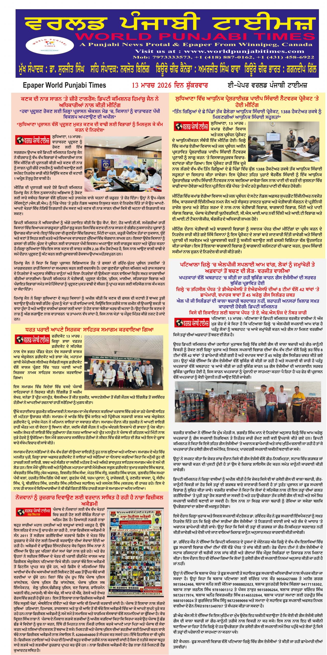 Posted inਪੰਜਾਬ ਕੋਹਲੀ ਤੇ ਗੋਗੀਆ ਵੱਲੋਂ ਮੁੱਖ ਮੰਤਰੀ ਮਾਵਾਂ‑ਧੀਆਂ ਸਤਿਕਾਰ ਯੋਜਨਾ ਬਾਰੇ ਜਾਗੋ ਕੱਢ ਕੇ ਜਾਗਰੂਕਤਾ ਮਹਿਲਾਵਾਂ ਨੂੰ ਆਤਮਨਿਰਭਰ ਬਣਾਉਣ ਲਈ ਸਰਕਾਰ ਵਚਨਬੱਧ: ਕੋਹਲੀ, ਗੋਗੀਆ ਪਟਿਆਲਾ, 13 ਮਾਰਚ (ਵਰਲਡ ਪੰਜਾਬੀ ਟਾਈਮਜ਼) ਪਟਿਆਲਾ ਦੇ ਵਿਧਾਇਕ ਅਜੀਤਪਾਲ ਸਿੰਘ ਕੋਹਲੀ ਅਤੇ ਨਗਰ ਨਿਗਮ ਦੇ ਮੇਅਰ ਕੁੰਦਨ ਗੋਗੀਆ ਨੇ ਪੰਜਾਬ… Posted by worldpunjabitimes March 13, 2026 Posted inਪੰਜਾਬ ਜ਼ਿਲ੍ਹੇ ‘ਚ ਪੈਟਰੋਲ, ਡੀਜ਼ਲ ਤੇ ਘਰੇਲੂ ਗੈਸ ਦੀ ਢੁਕਵੀਂ ਸਪਲਾਈ ਜਾਰੀ ਹੈ, ਘਬਰਾਹਟ ‘ਚ ਖਰੀਦਦਾਰੀ ਤੋਂ ਬਚੋ : ਡਿਪਟੀ ਕਮਿਸ਼ਨਰ *ਡੀ.ਸੀ ਹਿਮਾਂਸ਼ੂ ਜੈਨ ਨੇ ਪੈਟਰੋਲ ਪੰਪ ਅਤੇ ਗੈਸ ਏਜੰਸੀਆਂ ਦੇ ਨੁਮਾਇੰਦਿਆਂ ਨਾਲ ਕੀਤੀ ਮੀਟਿੰਗ* *ਜਮ੍ਹਾਂਖੋਰੀ ਕਰਨ ਵਾਲਿਆਂ 'ਤੇ ਹੋਵੇਗੀ ਸਖ਼ਤ ਕਾਰਵਾਈ: ਡੀ.ਸੀ ਹਿਮਾਂਸ਼ੂ ਜੈਨ* ਲੁਧਿਆਣਾ, 13 ਮਾਰਚ (ਵਰਲਡ ਪੰਜਾਬੀ ਟਾਈਮਜ਼)… Posted by worldpunjabitimes March 13, 2026