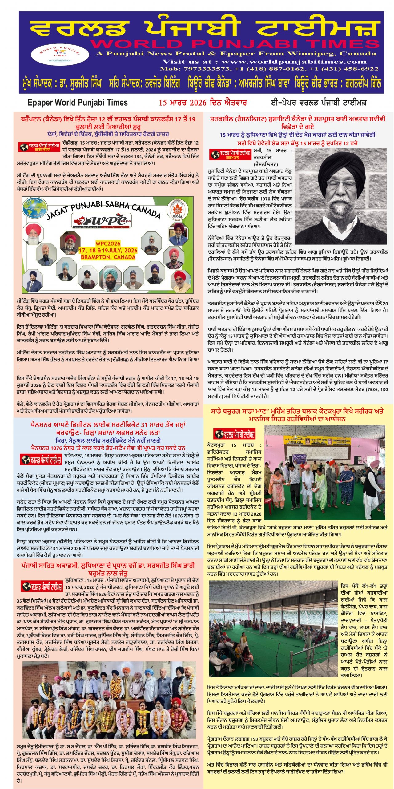 Posted inਦੇਸ਼ ਵਿਦੇਸ਼ ਤੋਂ ਤਰਕਸ਼ੀਲ (ਰੈਸ਼ਨਲਿਸਟ) ਸੁਸਾਇਟੀ ਕੈਨੇਡਾ ਦੇ ਸਰਪ੍ਰਸਤ ਬਾਈ ਅਵਤਾਰ ਸਦੀਵੀ ਵਿਛੋੜਾ ਦੇ ਗਏ 15 ਮਾਰਚ ਨੂੰ ਲੁਧਿਆਣਾ ਵਿਖੇ ਉਨ੍ਹਾਂ ਦੀ ਦੇਹ ਖੋਜ ਕਾਰਜਾਂ ਲਈ ਦਾਨ ਕੀਤਾ ਜਾਵੇਗੀ ਸਰੀ ਵਿਖੇ ਹੋਵੇਗੀ ਸ਼ੋਕ ਸਭਾ ਕੱਲ੍ਹ 15 ਮਾਰਚ ਨੂੰ ਦੁਪਹਿਰ 12 ਵਜੇ ਸਰੀ, 15 ਮਾਰਚ (ਹਰਦਮ ਮਾਨ/ਵਰਲਡ ਪੰਜਾਬੀ ਟਾਈਮਜ਼) ਤਰਕਸ਼ੀਲ (ਰੈਸ਼ਨਲਿਸਟ) ਸੁਸਾਇਟੀ ਕੈਨੇਡਾ ਦੇ ਸਰਪ੍ਰਸਤ ਬਾਈ… Posted by worldpunjabitimes March 15, 2026 Posted inਦੇਸ਼ ਵਿਦੇਸ਼ ਤੋਂ ਬਰੈੰਪਟਨ (ਕੈਨੇਡਾ) ਵਿਖੇ ਤਿੰਨ ਰੋਜ਼ਾ 12 ਵੀਂ ਵਰਲਡ ਪੰਜਾਬੀ ਕਾਨਫਰੰਸ 17 ਤੋੰ 19 ਜੁਲਾਈ ਲਈ ਤਿਆਰੀਆਂ ਸ਼ੁਰੂ ਦੇਸ਼ਾਂ, ਵਿਦੇਸ਼ਾਂ ਦੇ ਚਿੰਤਕ, ਬੁੱਧੀਜੀਵੀ ਤੇ ਸਾਹਿਤਕਾਰ ਹੋਣਗੇ ਹਾਜ਼ਰ ਚੰਡੀਗੜ੍ਹ, 15 ਮਾਰਚ (ਹਰਦੇਵ ਚੌਹਾਨ/ਵਰਲਡ ਪੰਜਾਬੀ ਟਾਈਮਜ਼) ਜਗਤ ਪੰਜਾਬੀ ਸਭਾ, ਬਰੈੰਪਟਨ (ਕੈਨੇਡਾ) ਵੱਲੋਂ ਤਿੰਨ ਰੋਜ਼ਾ 12 ਵੀਂ ਵਰਲਡ ਪੰਜਾਬੀ ਕਾਨਫਰੰਸ 17… Posted by worldpunjabitimes March 15, 2026