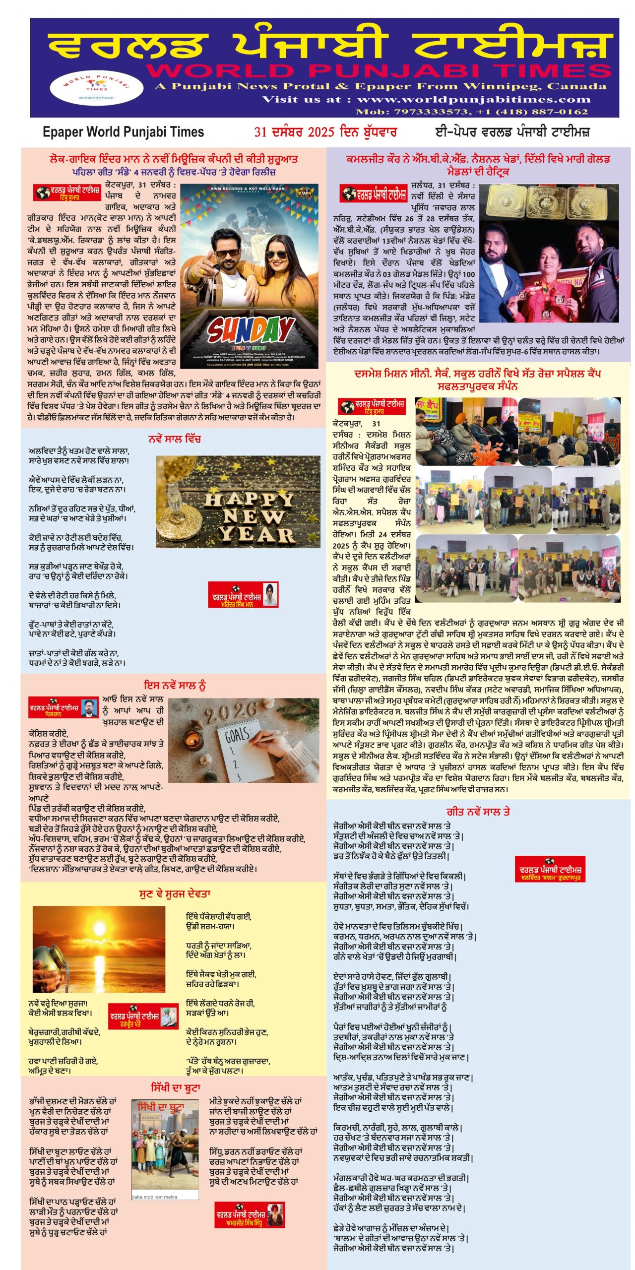 Posted inਈ-ਪੇਪਰ World Punjabi Times- Happy New Year 2026 Calendar Calendar 26Download Calendar 2026Download Posted by worldpunjabitimes December 31, 2025 Posted inਪੰਜਾਬ ਫਿਲਮ ਤੇ ਸੰਗੀਤ ਲੋਕ-ਗਾਇਕ ਇੰਦਰ ਮਾਨ ਨੇ ਨਵੀਂ ਮਿਊਜ਼ਿਕ ਕੰਪਨੀ ਦੀ ਕੀਤੀ ਸ਼ੁਰੂਆਤ ਪਹਿਲਾ ਗੀਤ ‘ਸੰਡੇ’ 4 ਜਨਵਰੀ ਨੂੰ ਵਿਸ਼ਵ-ਪੱਧਰ ’ਤੇ ਹੋਵੇਗਾ ਰਿਲੀਜ਼ ਕੋਟਕਪੂਰਾ, 31 ਦਸੰਬਰ (ਟਿੰਕੂ ਕੁਮਾਰ/ਵਰਲਡ ਪੰਜਾਬੀ ਟਾਈਮਜ਼) ਪੰਜਾਬ ਦੇ ਨਾਮਵਰ ਗਾਇਕ, ਅਦਾਕਾਰ ਅਤੇ ਗੀਤਕਾਰ ਇੰਦਰ ਮਾਨ (ਕੋਟ ਵਾਲਾ ਮਾਨ) ਨੇ… Posted by worldpunjabitimes December 31, 2025 Posted inਸਾਹਿਤ ਸਭਿਆਚਾਰ ਬੀਬੀ ਹਰਸ਼ਰਨ ਕੌਰ ਬੀਬੀ ਹਰਸ਼ਰਨ ਕੌਰ ਇੱਕ ਬਹੁਤ ਹੀ ਸ਼ਰਧਾਲੂ ਅਤੇ ਸਿੱਖ ਧਰਮ ਦੇ ਪ੍ਰਤੀ ਸਮਰਪਿਤ ਸਨ। ਉਹ ਗੁਰੂ ਗੋਬਿੰਦ ਸਿੰਘ ਜੀ ਦੇ ਇੱਕ ਨਜ਼ਦੀਕੀ ਸਾਥੀ ਭਾਈ ਮਨੀ ਸਿੰਘ ਦੀ ਧੀ ਸਨ। ਬੀਬੀ… Posted by worldpunjabitimes December 31, 2025 Posted inਸਾਹਿਤ ਸਭਿਆਚਾਰ ਇਸ ਨਵੇਂ ਸਾਲ ਨੂੰ ਆਓ ਇਸ ਨਵੇਂ ਸਾਲ ਨੂੰ ਆਪਾਂ ਆਪ ਹੀ ਖੁਸ਼ਹਾਲ ਬਣਾਉਣ ਦੀ ਕੋਸ਼ਿਸ਼ ਕਰੀਏ,ਨਫ਼ਰਤ ਤੇ ਈਰਖਾ ਨੂੰ ਛੱਡ ਕੇ ਭਾਈਚਾਰਕ ਸਾਂਝ ਤੇ ਪਿਆਰ ਵਧਾਉਣ ਦੀ ਕੋਸ਼ਿਸ਼ ਕਰੀਏ,ਰਿਸ਼ਤਿਆਂ ਨੂੰ ਗੂੜ੍ਹੇ ਮਜ਼ਬੂਤ ਬਣਾ… Posted by worldpunjabitimes December 31, 2025