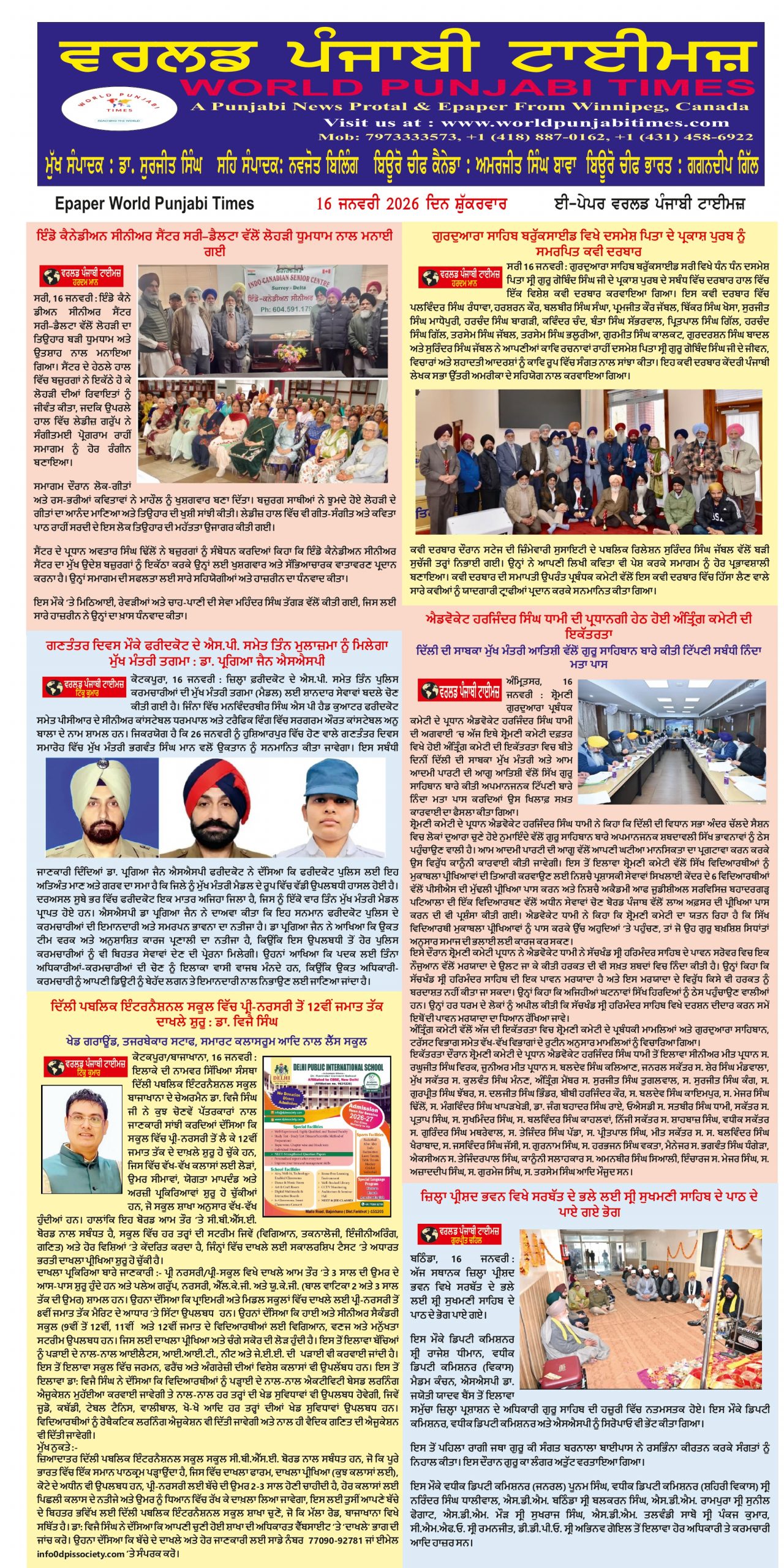Posted inਈ-ਪੇਪਰ World Punjabi Times-16.01.2026 16.01.26Download Posted by worldpunjabitimes January 16, 2026 Posted inਪੰਜਾਬ ਜ਼ਿਲ੍ਹਾ ਪ੍ਰੀਸ਼ਦ ਭਵਨ ਵਿਖੇ ਸਰਬੱਤ ਦੇ ਭਲੇ ਲਈ ਸ੍ਰੀ ਸੁਖਮਣੀ ਸਾਹਿਬ ਦੇ ਪਾਠ ਦੇ ਪਾਏ ਗਏ ਭੋਗ ਬਠਿੰਡਾ, 16 ਜਨਵਰੀ (ਗੁਰਪ੍ਰੀਤ ਚਹਿਲ/ਵਰਲਡ ਪੰਜਾਬੀ ਟਾਈਮਜ਼) ਅੱਜ ਸਥਾਨਕ ਜ਼ਿਲ੍ਹਾ ਪ੍ਰੀਸ਼ਦ ਭਵਨ ਵਿਖੇ ਸਰਬੱਤ ਦੇ ਭਲੇ ਲਈ ਸ਼੍ਰੀ ਸੁਖਮਣੀ ਸਾਹਿਬ ਦੇ ਪਾਠ ਦੇ ਭੋਗ ਪਾਏ ਗਏ। ਇਸ ਮੌਕੇ ਡਿਪਟੀ ਕਮਿਸ਼ਨਰ… Posted by worldpunjabitimes January 16, 2026 Posted inਪੰਜਾਬ ਐਡਵੋਕੇਟ ਹਰਜਿੰਦਰ ਸਿੰਘ ਧਾਮੀ ਦੀ ਪ੍ਰਧਾਨਗੀ ਹੇਠ ਹੋਈ ਅੰਤ੍ਰਿੰਗ ਕਮੇਟੀ ਦੀ ਇਕੱਤਰਤਾ ਦਿੱਲੀ ਦੀ ਸਾਬਕਾ ਮੁੱਖ ਮੰਤਰੀ ਆਤਿਸ਼ੀ ਵੱਲੋਂ ਗੁਰੂ ਸਾਹਿਬਾਨ ਬਾਰੇ ਕੀਤੀ ਟਿੱਪਣੀ ਸਬੰਧੀ ਨਿੰਦਾ ਮਤਾ ਪਾਸ ਅੰਮ੍ਰਿਤਸਰ, 16 ਜਨਵਰੀ (ਵਰਲਡ ਪੰਜਾਬੀ ਟਾਈਮਜ਼) ਸ਼੍ਰੋਮਣੀ ਗੁਰਦੁਆਰਾ ਪ੍ਰਬੰਧਕ ਕਮੇਟੀ ਦੇ ਪ੍ਰਧਾਨ ਐਡਵੋਕੇਟ ਹਰਜਿੰਦਰ… Posted by worldpunjabitimes January 16, 2026 Posted inਸਾਹਿਤ ਸਭਿਆਚਾਰ ਹਿੰਕ-ਪਾਕਿ ਪੰਜਾਬੀ ਗ਼ਜ਼ਲ ਦੇ ਤਿੰਨ ਲੋਕ- ਪਰਵਾਨ ਚਿਹਰੇ ਪਿਛਲੇ ਸਾਲ ਅਸੀਂ ਇਹਨੀਂ ਦਿਨੀਂ ਵਿਸ਼ਵ ਪੰਜਾਬੀ ਕਾਨਫਰੰਸ ਦੇ ਬਹਾਨੇ ਲਾਹੌਰ ਵਿੱਚ ਸਾਂ। ਸਾਡੇ ਕਾਫ਼ਲੇ ਦਾ ਮਿੱਠੜਾ ਸਾਥੀ ਤ੍ਰੈਲੋਚਨ ਲੋਚੀ ਲਾਹੌਰ ਵਿੱਚ ਵੜਨ ਸਾਰ ਏਧਰਲੇ ਪੰਜਾਬ ਜਿੰਨਾ ਹੀ ਅੱਖੀਆਂ ਦਾ… Posted by worldpunjabitimes January 16, 2026 Posted inਪੰਜਾਬ ਦਿੱਲੀ ਪਬਲਿਕ ਇੰਟਰਨੈਸ਼ਨਲ ਸਕੂਲ ਵਿੱਚ ਪ੍ਰੀ-ਨਰਸਰੀ ਤੋਂ 12ਵੀਂ ਜਮਾਤ ਤੱਕ ਦਾਖਲੇ ਸ਼ੁਰੂ : ਡਾ. ਵਿਜੈ ਸਿੰਘ ਖੇਡ ਗਰਾਊਂਡ, ਤਜਰਬੇਕਾਰ ਸਟਾਫ, ਸਮਾਰਟ ਕਲਾਸਰੂਮ ਆਦਿ ਨਾਲ ਲੈੱਸ ਸਕੂਲ ਕੋਟਕਪੂਰਾ/ਬਾਜਾਖਾਨਾ, 16 ਜਨਵਰੀ (ਟਿੰਕੂ ਕੁਮਾਰ/ਵਰਲਡ ਪੰਜਾਬੀ ਟਾਈਮਜ਼) ਇਲਾਕੇ ਦੀ ਨਾਮਵਰ ਸਿੱਖਿਆ ਸੰਸਥਾ ਦਿੱਲੀ ਪਬਲਿਕ ਇੰਟਰਨੈਸ਼ਨਲ ਸਕੂਲ ਬਾਜਾਖਾਨਾ ਦੇ ਚੇਅਰਮੈਨ ਡਾ.… Posted by worldpunjabitimes January 16, 2026 Posted inਸਾਹਿਤ ਸਭਿਆਚਾਰ ਵੋਹ ਗ਼ਰੀਬ ਨਹੀਂ ਹੋਤਾ ਵੋਹ ਗ਼ਰੀਬ ਨਹੀਂ ਹੋਤਾ ਹੈ ਜਿਸ ਕੇ ਪਾਸ ਦੌਲਤ ਪਿਆਰ ਕੀ ਹੋ,ਵੋਹ ਇਸ਼ਕ ਮੁਕੰਮਲ ਹੋ ਜਾਤਾ ਹੈ ਜਿਸ ਮੇਂ ਸੱਚੀ ਨੀਅਤ ਇਜ਼ਹਾਰ ਕੀ ਹੋ,ਉਸ ਕਲੀ ਮੇਂ ਖੁਸ਼ਬੂ ਨਹੀਂ ਹੋਤੀ ਜੋ… Posted by worldpunjabitimes January 16, 2026