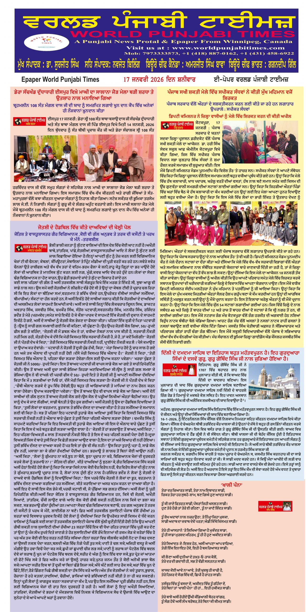 Posted inਈ-ਪੇਪਰ World Punjabi times-17.01.2026 17.01.2026Download Posted by worldpunjabitimes January 17, 2026 Posted inਸਾਹਿਤ ਸਭਿਆਚਾਰ ਜੋਤਸ਼ੀ ਦੇ ਹੈਂਡਬਿਲ ਵਿੱਚ ਕੀਤੇ ਦਾਅਵਿਆਂ ਦੀ ਖੋਲ੍ਹੀ ਪੋਲ ਜੋਤਿਸ਼ ਤੇ ਵਾਸਤੂਸ਼ਾਸਤਰ ਗੈਰ ਵਿਗਿਆਨਕ ,ਕੋਈ ਵੀ ਗੱਲ ਅਨੁਭਵ ਤੇ ਤਰਕ ਦੀ ਕਸੌਟੀ ਤੇ ਪਰਖ ਕੇ ਮੰਨੋ --ਤਰਕਸ਼ੀਲ ਭੋਲੀ ਭਾਲੀ ਜਨਤਾ ਨੂੰ ਲੁੱਟਣ ਵਾਲਿਆਂ ਦੀ ਇਸ ਦੇਸ਼ ਵਿੱਚ ਕੋਈ ਘਾਟ… Posted by worldpunjabitimes January 17, 2026 Posted inਸਾਹਿਤ ਸਭਿਆਚਾਰ ਦਿੱਲੀ ਦੇ ਦਮਦਮਾ ਸਾਹਿਬ ਦਾ ਇਤਿਹਾਸ ਬਹੁਤ ਮਹੱਤਵਪੂਰਨ ਹੈ। ਇਹ ਗੁਰਦੁਆਰਾ ਸਿੱਖਾਂ ਦੇ ਦਸਵੇਂ ਗੁਰੂ, ਗੁਰੂ ਗੋਬਿੰਦ ਸਿੰਘ ਜੀ ਨਾਲ ਜੁੜਿਆ ਹੋਇਆ ਹੈ। ਇਤਿਹਾਸ: ਗੁਰੂ ਗੋਬਿੰਦ ਸਿੰਘ ਜੀ ਨੇ 1707 ਵਿੱਚ ਬਹਾਦਰ ਸ਼ਾਹ ਨਾਲ ਮੁਲਾਕਾਤ ਕੀਤੀ ਸੀ, ਜੋ ਕਿ ਬਾਅਦ ਵਿੱਚ ਦਿੱਲੀ ਦਾ ਬਾਦਸ਼ਾਹ ਬਣਿਆ। ਇਸ ਮੁਲਾਕਾਤ ਦੀ ਯਾਦ ਵਿੱਚ ਗੁਰਦੁਆਰਾ ਦਮਦਮਾ ਸਾਹਿਬ… Posted by worldpunjabitimes January 17, 2026 Posted inਪੰਜਾਬ ਡੇਰਾ ਸੱਚਖੰਡ ਦੁੱਧਾਧਾਰੀ ਈਸਪੁਰ ਵਿਖ਼ੇ ਮਾਘੀ ਦਾ ਸਾਲਾਨਾ ਜੋੜ ਮੇਲਾ ਬੜੀ ਸ਼ਰਧਾ ਤੇ ਉਤਸ਼ਾਹ ਨਾਲ ਮਨਾਇਆ ਗਿਆ ਬ੍ਰਹਮਲੀਨ 108 ਸੰਤ ਮੰਗਲ ਦਾਸ ਜੀ ਦੀ ਯਾਦ ਨੂੰ ਸਮਰਪਿਤ ਲਗਾਏ ਖੂਨ ਦਾਨ ਕੈਂਪ ਵਿੱਚ ਅਨੇਕਾਂ ਹੀ ਨੌਜਵਾਨਾਂ ਖ਼ੂਨਦਾਨ ਕੀਤਾ ਈਸਪੁਰ 17 ਜਨਵਰੀ (ਅਸ਼ੋਕ ਸ਼ਰਮਾ ਸੂਦ ਵਿਰਕ/ਵਰਲਡ ਪੰਜਾਬੀ ਟਾਈਮਜ਼) ਡੇਰਾ… Posted by worldpunjabitimes January 17, 2026 Posted inਪੰਜਾਬ ਪੰਜਾਬ ਸਖੀ ਸ਼ਕਤੀ ਮੇਲੇ ਵਿੱਚ ਸਪੀਕਰ ਸੰਧਵਾਂ ਨੇ ਕੀਤੀ ਮੁੱਖ ਮਹਿਮਾਨ ਵਜੋਂ ਸ਼ਿਰਕਤ ਪੰਜਾਬ ਸਰਕਾਰ ਵੱਲੋਂ ਔਰਤਾਂ ਦੇ ਸਸ਼ਕਤੀਕਰਨ ਕਰਨ ਲਈ ਕੀਤੇ ਜਾ ਰਹੇ ਹਨ ਲਗਾਤਾਰ ਉਪਰਾਲੇ : ਸਪੀਕਰ ਸੰਧਵਾਂ ਡਿਪਟੀ ਕਮਿਸ਼ਨਰ ਨੇ ਜ਼ਿਲ੍ਹਾ ਵਾਸੀਆਂ ਨੂੰ ਮੇਲੇ ਵਿੱਚ ਸ਼ਿਰਕਤ ਕਰਨ ਦੀ ਕੀਤੀ ਅਪੀਲ… Posted by worldpunjabitimes January 17, 2026 Posted inਪੰਜਾਬ ਤੇਜਧਾਰ ਹਥਿਆਰਾਂ ਦੀ ਨੋਕ ’ਤੇ ਲੁੱਟ-ਖੋਹ ਕਰਨ ਦੀ ਤਾਕ ਵਿੱਚ ਬੈਠਾ ਗਿਰੋਹ ਪੁਲਿਸ ਅੜਿੱਕੇ ਦੋਸ਼ੀਆਂ ਖਿਲਾਫ ਪਹਿਲਾਂ ਵੀ ਚੋਰੀ ਅਤੇ ਹੋਰ ਸੰਗੀਨ ਧਾਰਾਵਾਂ ਤਹਿਤ ਮੁਕੱਦਮੇ ਦਰਜ ਕੋਟਕਪੂਰਾ, 17 ਜਨਵਰੀ (ਟਿੰਕੂ ਕੁਮਾਰ/ਵਰਲਡ ਪੰਜਾਬੀ ਟਾਈਮਜ਼) ਡਾ. ਪ੍ਰਗਿਆ ਜੈਨ ਐਸ.ਐਸ.ਪੀ. ਫਰੀਦਕੋਟ ਦੀ ਅਗਵਾਈ ਹੇਠ ਫਰੀਦਕੋਟ ਪੁਲਿਸ ਵੱਲੋਂ… Posted by worldpunjabitimes January 17, 2026