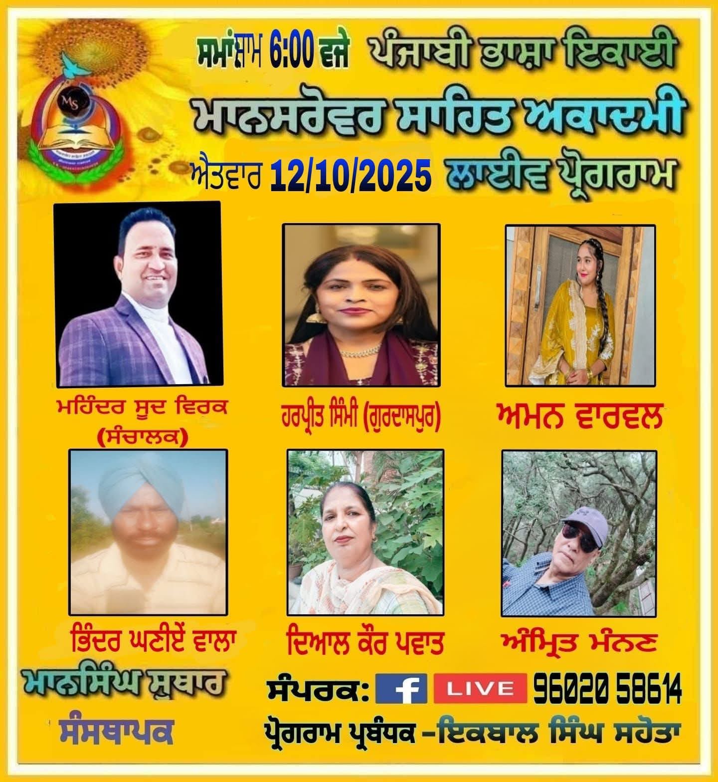 ਪੰਜਾਬੀ ਲਾਇਵ ਪ੍ਰੋਗਰਾਮ ਮਾਨਸਰੋਵਰ ਸਾਹਿਤ ਅਕਾਦਮੀ ਦਾ ਮਾਣ ਵਧਾਵੇ ਮਾਂ ਬੋਲੀ ਪੰਜਾਬੀ ਦਾ – ਸੂਦ ਵਿਰਕ