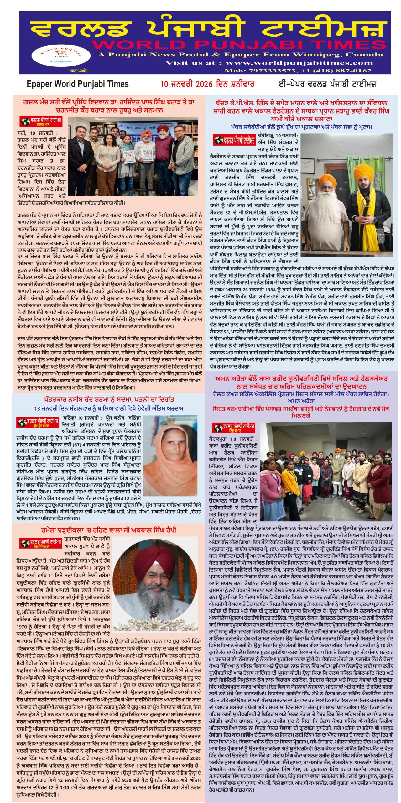 Posted inਈ-ਪੇਪਰ World Punjabi Times-10.01.2026 10.01.2026Download Posted by worldpunjabitimes January 10, 2026 Posted inਪੰਜਾਬ ਬੁੱਚੜ ਕੇ.ਪੀ.ਐਸ. ਗਿੱਲ ਦੇ ਚਪੇੜ ਮਾਰਨ ਵਾਲੇ ਅਤੇ ਖ਼ਾਲਿਸਤਾਨ ਦਾ ਸੰਵਿਧਾਨ ਜਾਰੀ ਕਰਨ ਵਾਲੇ ਅਕਾਲ ਫੈਡਰੇਸ਼ਨ ਦੇ ਸਾਬਕਾ ਪ੍ਰਧਾਨ ਜੁਝਾਰੂ ਭਾਈ ਕੰਵਰ ਸਿੰਘ ਧਾਮੀ ਕੀਤੇ ਅਕਾਲ ਚਲਾਣਾ ਪੰਥਕ ਜਥੇਬੰਦੀਆਂ ਵੱਲੋਂ ਡੂੰਘੇ ਦੁੱਖ ਦਾ ਪ੍ਰਗਟਾਵਾ ਅਤੇ ਪੰਥਕ ਸੇਵਾ ਨੂੰ ਪ੍ਰਣਾਮ ਚੰਡੀਗੜ੍ਹ, 10 ਜਨਵਰੀ (ਵਰਲਡ ਪੰਜਾਬੀ ਟਾਈਮਜ਼ ) ਅੱਜ ਸਿੱਖ ਸੰਘਰਸ਼ ਦੇ ਜੁਝਾਰੂ ਯੋਧੇ ਅਤੇ ਅਕਾਲ ਫੈਡਰੇਸ਼ਨ ਦੇ ਸਾਬਕਾ… Posted by worldpunjabitimes January 10, 2026 Posted inਪੰਜਾਬ ਚਾਈਨਾ ਡੋਰ ਦੀ ਵਿਕਰੀ ਅਤੇ ਵਰਤੋਂ ਰੋਕਣ ਲਈ ਜਨਰਲ ਮਰਚੈਂਟਸ ਐਸੋਸੀਏਸ਼ਨ ਦਾ ਸ਼ਾਨਦਾਰ ਉਪਰਾਲਾ ਡੀਐਸਪੀ ਅਤੇ ਐੱਸਐੱਚਓ ਤੋਂ ਪੋਸਟਰ ਰਿਲੀਜ਼ ਕਰਵਾ ਕੇ ਸਹਿਯੋਗ ਦੀ ਕੀਤੀ ਅਪੀਲ ਚਾਈਨਾ ਡੋਰ ਵੇਚਣ ਵਾਲਿਆਂ ਖਿਲਾਫ ਹੋਵੇਗੀ ਸਖਤ ਕਾਰਵਾਈ : ਡੀ.ਐਸ.ਪੀ. ਕੋਟਕਪੁਰਾ, 10 ਜਨਵਰੀ (ਟਿੰਕੂ ਕੁਮਾਰ/ਵਰਲਡ ਪੰਜਾਬੀ ਟਾਈਮਜ਼) ਹਰ… Posted by worldpunjabitimes January 10, 2026 Posted inਪੰਜਾਬ ਹਰ ਪਿੰਡ, ਹਰ ਵਾਰਡ ਦੀ ਜਾਂਚ ਹੋਵੇ, ਪਾਣੀ ਸੰਕਟ ’ਤੇ ਅਰਸ਼ ਸੱਚਰ ਦੀ ਸਰਕਾਰ ਨੂੰ ਅਪੀਲ ਫਰੀਦਕੋਟ ਵਿੱਚ ਧਰਤੀ ਹੇਠਲਾ ਪਾਣੀ ਪੀਣਯੋਗ ਨਹੀਂ, ਭਿਆਨਕ ਬਿਮਾਰੀਆਂ ਫੈਲਣ ਦਾ ਖਤਰਾ : ਅਰਸ਼ ਸੱਚਰ ਅਰਸ਼ ਸੱਚਰ ਵੱਲੋਂ ਮੁੱਖ ਮੰਤਰੀ ਕੋਲ ਲੋਕ ਸਿਹਤ ਐਮਰਜੈਂਸੀ ਐਲਾਨਣ ਦੀ ਮੰਗ ਕੋਟਕਪੂਰਾ, 10 ਜਨਵਰੀ… Posted by worldpunjabitimes January 10, 2026 Posted inਪੰਜਾਬ ਤਰਕਸ਼ੀਲ ਆਗੂਆਂ ਨੇ ਦਰੱਖਤਾਂ ਦੀ ਸੰਭਾਲ ਲਈ ਲੋਕਾਂ ਨੂੰ ਜਾਗਰੂਕ ਕਰਨ ਦਾ ਚੁੱਕਿਆ ਬੀੜਾ ਦਰੱਖਤਾਂ ਦੇ ਖਾਤਮੇ ਵਾਲੀਆਂ ਸਾਜਿਸ਼ਾਂ ਦੇ ਕਰਾਂਗੇ ਪਰਦੇਫਾਸ਼ : ਬਰਾੜ/ਹਾਲੀ ਕੋਟਕਪੂਰਾ, 10 ਜਨਵਰੀ (ਟਿੰਕੂ ਕੁਮਾਰ/ਵਰਲਡ ਪੰਜਾਬੀ ਟਾਈਮਜ਼) ਵਾਤਾਵਰਨ ਅਤੇ ਰੁੱਖਾਂ ਦੀ ਸੰਭਾਲ ਵਿੱਚ ਜੁਟੀ ‘ਸੀਰ’ ਸੰਸਥਾ ਫਰੀਦਕੋਟ ਦੇ ਸੰਸਥਾਪਕ ਸੰਦੀਪ… Posted by worldpunjabitimes January 10, 2026 Posted inਪੰਜਾਬ ਮਿਸ਼ਨ 2027 ਅਰਸ਼ ਸੱਚਰ ਵੱਲੋਂ ਫ਼ਰੀਦਕੋਟ ਵਿਧਾਨ ਸਭਾ ਹਲਕੇ ਦੇ ਹੋਰ 5 ਪਿੰਡਾਂ ਦਾ ਦੌਰਾ ਕੋਟਕਪੂਰਾ, 10 ਜਨਵਰੀ (ਟਿੰਕੂ ਕੁਮਾਰ/ਵਰਲਡ ਪੰਜਾਬੀ ਟਾਈਮਜ਼) ਸਮਾਜਸੇਵੀ ਅਤੇ ਆਮ ਆਦਮੀ ਪਾਰਟੀ ਦੇ ਸੀਨੀਅਰ ਲੀਡਰ ਅਰਸ਼ ਸੱਚਰ ਵੱਲੋਂ ‘ਮਿਸ਼ਨ 2027’ ਤਹਿਤ ਫ਼ਰੀਦਕੋਟ ਵਿਧਾਨ ਸਭਾ ਹਲਕੇ ਦੇ ਹੋਰ ਪੰਜ ਪਿੰਡਾਂ-ਮਚਾਕੀ ਖੁਰਦ,… Posted by worldpunjabitimes January 10, 2026
