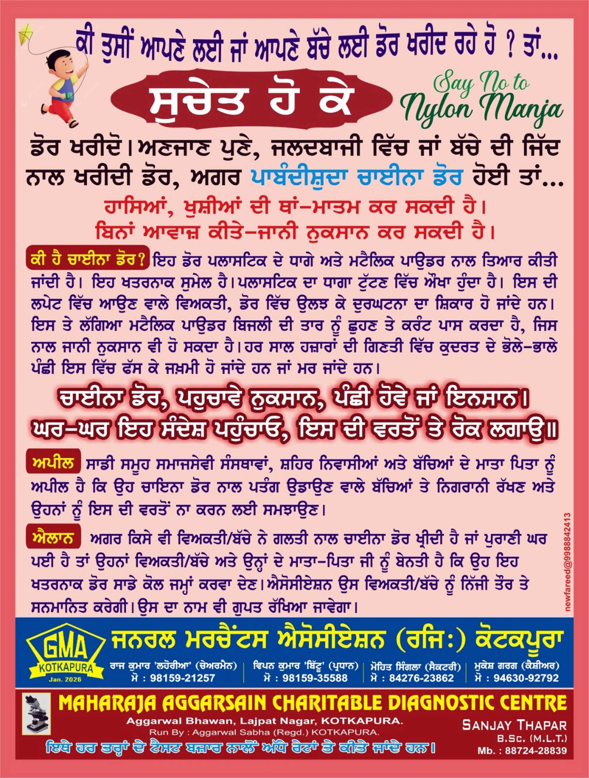 Posted inਪੰਜਾਬ ਚਾਈਨਾ ਡੋਰ ਦੀ ਵਿਕਰੀ ਅਤੇ ਵਰਤੋਂ ਰੋਕਣ ਲਈ ਜਨਰਲ ਮਰਚੈਂਟਸ ਐਸੋਸੀਏਸ਼ਨ ਦਾ ਸ਼ਾਨਦਾਰ ਉਪਰਾਲਾ ਡੀਐਸਪੀ ਅਤੇ ਐੱਸਐੱਚਓ ਤੋਂ ਪੋਸਟਰ ਰਿਲੀਜ਼ ਕਰਵਾ ਕੇ ਸਹਿਯੋਗ ਦੀ ਕੀਤੀ ਅਪੀਲ ਚਾਈਨਾ ਡੋਰ ਵੇਚਣ ਵਾਲਿਆਂ ਖਿਲਾਫ ਹੋਵੇਗੀ ਸਖਤ ਕਾਰਵਾਈ : ਡੀ.ਐਸ.ਪੀ. ਕੋਟਕਪੁਰਾ, 10 ਜਨਵਰੀ (ਟਿੰਕੂ ਕੁਮਾਰ/ਵਰਲਡ ਪੰਜਾਬੀ ਟਾਈਮਜ਼) ਹਰ… Posted by worldpunjabitimes January 10, 2026 Posted inਪੰਜਾਬ ਹਰ ਪਿੰਡ, ਹਰ ਵਾਰਡ ਦੀ ਜਾਂਚ ਹੋਵੇ, ਪਾਣੀ ਸੰਕਟ ’ਤੇ ਅਰਸ਼ ਸੱਚਰ ਦੀ ਸਰਕਾਰ ਨੂੰ ਅਪੀਲ ਫਰੀਦਕੋਟ ਵਿੱਚ ਧਰਤੀ ਹੇਠਲਾ ਪਾਣੀ ਪੀਣਯੋਗ ਨਹੀਂ, ਭਿਆਨਕ ਬਿਮਾਰੀਆਂ ਫੈਲਣ ਦਾ ਖਤਰਾ : ਅਰਸ਼ ਸੱਚਰ ਅਰਸ਼ ਸੱਚਰ ਵੱਲੋਂ ਮੁੱਖ ਮੰਤਰੀ ਕੋਲ ਲੋਕ ਸਿਹਤ ਐਮਰਜੈਂਸੀ ਐਲਾਨਣ ਦੀ ਮੰਗ ਕੋਟਕਪੂਰਾ, 10 ਜਨਵਰੀ… Posted by worldpunjabitimes January 10, 2026 Posted inਪੰਜਾਬ ਤਰਕਸ਼ੀਲ ਆਗੂਆਂ ਨੇ ਦਰੱਖਤਾਂ ਦੀ ਸੰਭਾਲ ਲਈ ਲੋਕਾਂ ਨੂੰ ਜਾਗਰੂਕ ਕਰਨ ਦਾ ਚੁੱਕਿਆ ਬੀੜਾ ਦਰੱਖਤਾਂ ਦੇ ਖਾਤਮੇ ਵਾਲੀਆਂ ਸਾਜਿਸ਼ਾਂ ਦੇ ਕਰਾਂਗੇ ਪਰਦੇਫਾਸ਼ : ਬਰਾੜ/ਹਾਲੀ ਕੋਟਕਪੂਰਾ, 10 ਜਨਵਰੀ (ਟਿੰਕੂ ਕੁਮਾਰ/ਵਰਲਡ ਪੰਜਾਬੀ ਟਾਈਮਜ਼) ਵਾਤਾਵਰਨ ਅਤੇ ਰੁੱਖਾਂ ਦੀ ਸੰਭਾਲ ਵਿੱਚ ਜੁਟੀ ‘ਸੀਰ’ ਸੰਸਥਾ ਫਰੀਦਕੋਟ ਦੇ ਸੰਸਥਾਪਕ ਸੰਦੀਪ… Posted by worldpunjabitimes January 10, 2026 Posted inਪੰਜਾਬ ਮਿਸ਼ਨ 2027 ਅਰਸ਼ ਸੱਚਰ ਵੱਲੋਂ ਫ਼ਰੀਦਕੋਟ ਵਿਧਾਨ ਸਭਾ ਹਲਕੇ ਦੇ ਹੋਰ 5 ਪਿੰਡਾਂ ਦਾ ਦੌਰਾ ਕੋਟਕਪੂਰਾ, 10 ਜਨਵਰੀ (ਟਿੰਕੂ ਕੁਮਾਰ/ਵਰਲਡ ਪੰਜਾਬੀ ਟਾਈਮਜ਼) ਸਮਾਜਸੇਵੀ ਅਤੇ ਆਮ ਆਦਮੀ ਪਾਰਟੀ ਦੇ ਸੀਨੀਅਰ ਲੀਡਰ ਅਰਸ਼ ਸੱਚਰ ਵੱਲੋਂ ‘ਮਿਸ਼ਨ 2027’ ਤਹਿਤ ਫ਼ਰੀਦਕੋਟ ਵਿਧਾਨ ਸਭਾ ਹਲਕੇ ਦੇ ਹੋਰ ਪੰਜ ਪਿੰਡਾਂ-ਮਚਾਕੀ ਖੁਰਦ,… Posted by worldpunjabitimes January 10, 2026