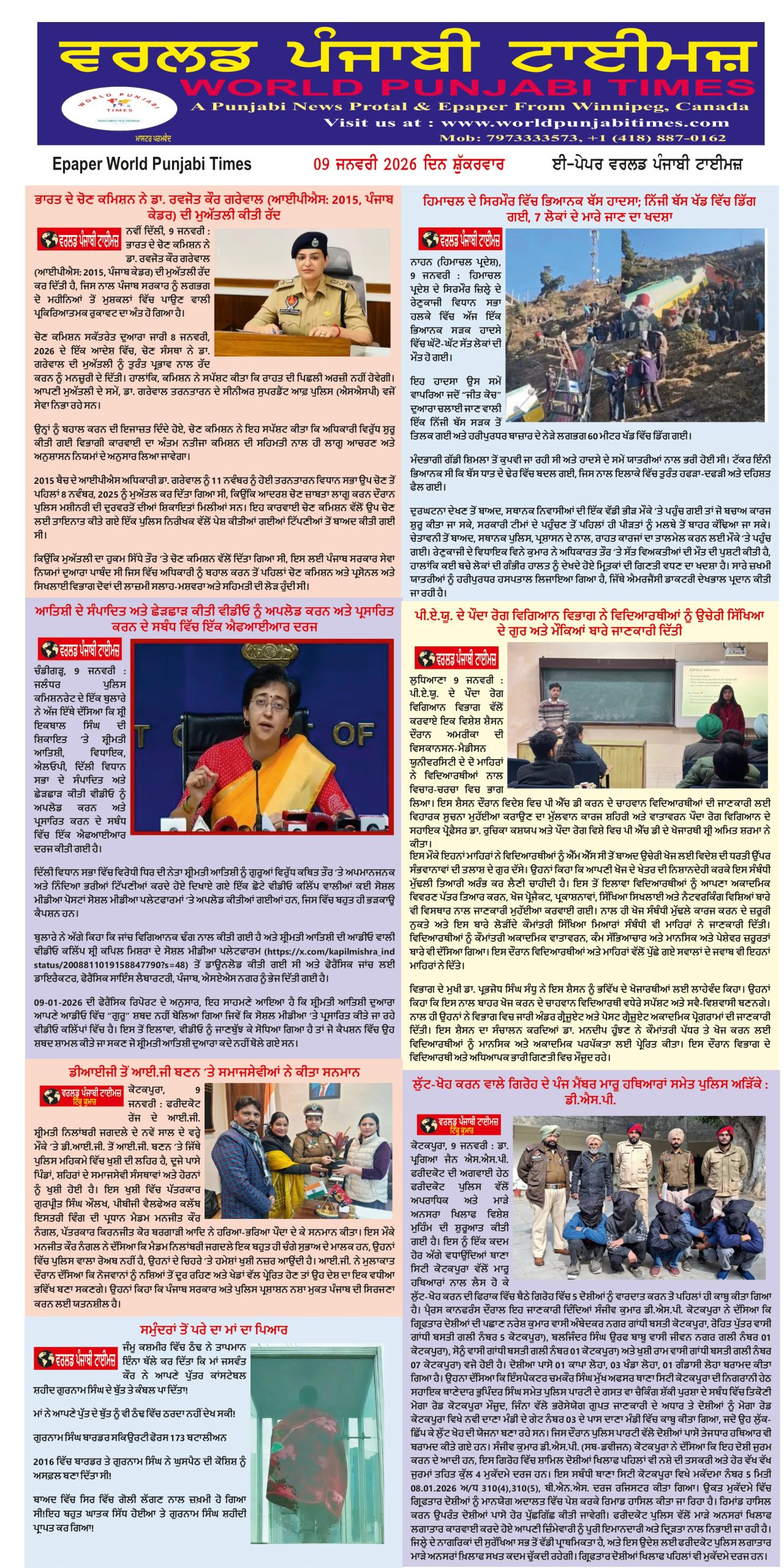 Posted inਪੰਜਾਬ ਲੁੱਟ-ਖੋਹ ਕਰਨ ਵਾਲੇ ਗਿਰੋਹ ਦੇ ਪੰਜ ਮੈਂਬਰ ਮਾਰੂ ਹਥਿਆਰਾਂ ਸਮੇਤ ਪੁਲਿਸ ਅੜਿੱਕੇ : ਡੀ.ਐਸ.ਪੀ. ਕੋਟਕਪੂਰਾ, 9 ਜਨਵਰੀ (ਟਿੰਕੂ ਕੁਮਾਰ/ਵਰਲਡ ਪੰਜਾਬੀ ਟਾਈਮਜ਼) ਡਾ. ਪ੍ਰਗਿਆ ਜੈਨ ਐਸ.ਐਸ.ਪੀ. ਫਰੀਦਕੋਟ ਦੀ ਅਗਵਾਈ ਹੇਠ ਫਰੀਦਕੋਟ ਪੁਲਿਸ ਵੱਲੋਂ ਅਪਰਾਧਿਕ ਅਤੇ ਮਾੜੇ ਅਨਸਰਾ ਖਿਲਾਫ ਵਿਸ਼ੇਸ਼ ਮੁਹਿੰਮ ਦੀ ਸ਼ੁਰੂਆਤ ਕੀਤੀ ਗਈ ਹੈ।… Posted by worldpunjabitimes January 9, 2026 Posted inਪੰਜਾਬ ਆਤਿਸ਼ੀ ਦੇ ਸੰਪਾਦਿਤ ਅਤੇ ਛੇੜਛਾੜ ਕੀਤੀ ਵੀਡੀਓ ਨੂੰ ਅਪਲੋਡ ਕਰਨ ਅਤੇ ਪ੍ਰਸਾਰਿਤ ਕਰਨ ਦੇ ਸਬੰਧ ਵਿੱਚ ਇੱਕ ਐਫਆਈਆਰ ਦਰਜ ਚੰਡੀਗੜ੍ਹ, 9 ਜਨਵਰੀ,(ਵਰਲਡ ਪੰਜਾਬੀ ਟਾਈਮਜ਼ ) ਜਲੰਧਰ ਪੁਲਿਸ ਕਮਿਸ਼ਨਰੇਟ ਦੇ ਇੱਕ ਬੁਲਾਰੇ ਨੇ ਅੱਜ ਇੱਥੇ ਦੱਸਿਆ ਕਿ ਸ਼੍ਰੀ ਇਕਬਾਲ ਸਿੰਘ ਦੀ ਸ਼ਿਕਾਇਤ 'ਤੇ ਸ਼੍ਰੀਮਤੀ ਆਤਿਸ਼ੀ, ਵਿਧਾਇਕ, ਐਲਓਪੀ, ਦਿੱਲੀ ਵਿਧਾਨ ਸਭਾ… Posted by worldpunjabitimes January 9, 2026