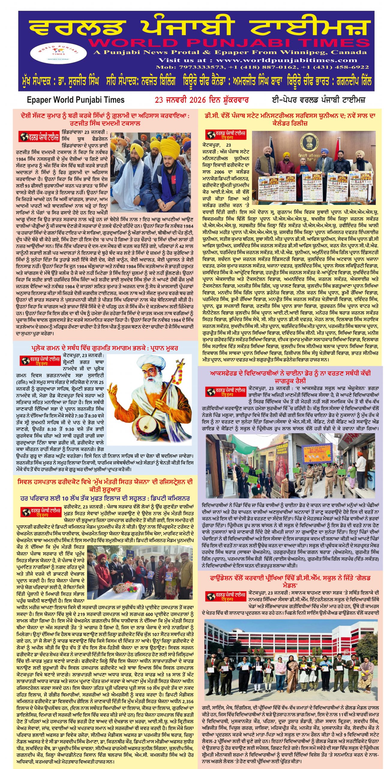 Posted inਸਾਹਿਤ ਸਭਿਆਚਾਰ ਸੱਜਣਾ ਵੇ ਤੇਰੀ ਮੇਰੀ ਪ੍ਰੀਤ ਕਹਾਣੀ ਸੱਜਣਾ ਵੇ।ਹੁੰਦੇ ਜਿੱਦਾਂ ਅੱਗ ਤੇ ਪਾਣੀ ਸੱਜਣਾ ਵੇ।ਗੈਰਾਂ ਤੇ ਕੀ ਦੋਸ਼ ਕਿਸੇ ਤੇ ਸ਼ਿਕਵਾ ਕੀ,ਦੁਸ਼ਮਣ ਤਾਂ ਹੈ ਆਪਣੀ ਢਾਣੀ ਸੱਜਣਾ ਵੇ।ਪੱਥਰਾਂ ਵਰਗੇ ਸ਼ਹਿਰੀਂ ਅੱਜ ਵੀ ਚੱਲਦੀ… Posted by worldpunjabitimes January 23, 2026 Posted inਪੰਜਾਬ ਡੀ ਮੋਂਟਫੋਰਟ ਯੂਨੀਵਰਸਿਟੀ ਯੂ.ਕੇ. ਵੱਲੋਂ ਅਪ੍ਰੈਲ ਇੰਟੇਕ ਲਈ ਦਾਖ਼ਲੇ ਖੁੱਲ੍ਹੇ : ਡਾਇਰੈਕਟਰ ਕੋਟਕਪੂਰਾ, 23 ਜਨਵਰੀ (ਟਿੰਕੂ ਕੁਮਾਰ/ਵਰਲਡ ਪੰਜਾਬੀ ਟਾਈਮਜ਼) ਸਥਾਨਕ ਮੁਕਤਸਰ ਰੋਡ ’ਤੇ ਰੇਲਵੇ ਪੁਲ ਨੇੜੇ ਸਥਿੱਤ ਚੰਡੀਗੜ੍ਹ ਆਈਲੈਟਸ ਐਂਡ ਇੰਮੀਗ੍ਰੇਸ਼ਨ ਸੈਂਟਰ (ਸੀ.ਆਈ.ਆਈ.ਸੀ) ਕੋਟਕਪੂਰਾ ਦੇ ਚੇਅਰਮੈਨ ਵਾਸੂ ਸ਼ਰਮਾ ਅਤੇ ਡਾਇਰੈਕਟਰ ਮੈਡਮ ਰਕਸ਼ੰਦਾ… Posted by worldpunjabitimes January 23, 2026