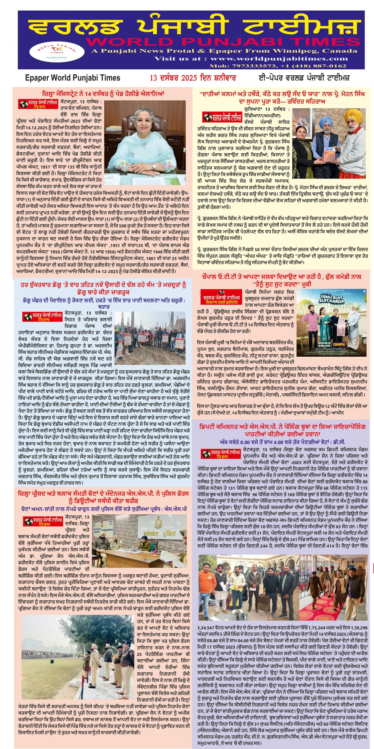 Posted inਈ-ਪੇਪਰ World Punjabi Times-13.12.2025 13.12.2025Download Posted by worldpunjabitimes December 13, 2025 Posted inਪੰਜਾਬ ਡਿਪਟੀ ਕਮਿਸ਼ਨਰ ਅਤੇ ਐਸ.ਐਸ.ਪੀ. ਨੇ ਪੋਲਿੰਗ ਬੂਥਾਂ ਦਾ ਲਿਆ ਜਾਇਜ਼ਾਪੋਲਿੰਗ ਪਾਰਟੀਆਂ ਕੀਤੀਆਂ ਗਈਆਂ ਰਵਾਨਾ ਅੱਜ ਸਵੇਰੇ 8.00 ਵਜੇ ਤੋਂ ਸ਼ਾਮ 4.00 ਵਜੇ ਤੱਕ ਪੈਣਗੀਆਂ ਵੋਟਾਂ : ਡੀ.ਸੀ. ਕੋਟਕਪੂਰਾ, 13 ਦਸੰਬਰ (ਟਿੰਕੂ ਕੁਮਾਰ/ਵਰਲਡ ਪੰਜਾਬੀ ਟਾਈਮਜ਼) ਜਿਲ੍ਹਾ ਚੋਣ ਅਫਸਰ ਕਮ ਡਿਪਟੀ ਕਮਿਸ਼ਨਰ ਮੈਡਮ ਪੂਨਮਦੀਪ ਕੌਰ ਅਤੇ… Posted by worldpunjabitimes December 13, 2025 Posted inਪੰਜਾਬ ਜ਼ਿਲ੍ਹਾ ਪ੍ਰੀਸ਼ਦ ਅਤੇ ਬਲਾਕ ਸੰਮਤੀ ਚੋਣਾਂ ਦੇ ਮੱਦੇਨਜਰ ਐਸ.ਐਸ.ਪੀ. ਨੇ ਪੁਲਿਸ ਫੋਰਸ ਨੂੰ ਡਿਊਟੀਆਂ ਸਬੰਧੀ ਕੀਤਾ ਬਰੀਫ ਚੋਣਾਂ ਅਮਨ-ਸ਼ਾਂਤੀ ਨਾਲ ਨੇਪਰੇ ਚਾੜ੍ਹਨ ਲਈ ਪੁਲਿਸ ਵੱਲੋਂ ਕੜੇ ਸੁਰੱਖਿਆ ਪ੍ਰਬੰਧ : ਐਸ.ਐਸ.ਪੀ ਕੋਟਕਪੂਰਾ, 13 ਦਸੰਬਰ (ਟਿੰਕੂ ਕੁਮਾਰ/ਵਰਲਡ ਪੰਜਾਬੀ ਟਾਈਮਜ਼) ਜ਼ਿਲ੍ਹਾ ਪ੍ਰੀਸ਼ਦ ਅਤੇ ਬਲਾਕ ਸੰਮਤੀ ਚੋਣਾਂ ਸਬੰਧੀ ਫਰੀਦਕੋਟ ਪੁਲਿਸ ਵੱਲੋਂ… Posted by worldpunjabitimes December 13, 2025 Posted inਪੰਜਾਬ ਭਾਜਪਾ ਨੇ ਹਰ ਪਿੰਡ ’ਚ ਆਪਣੇ ਉਮੀਦਵਾਰ ਖੜੇ ਕੀਤੇ : ਰਾਜਨ ਨਾਰੰਗ *ਰਾਜਨ ਨਾਰੰਗ ਨੇ ਕਿਹਾ! ਸੂਬੇ ਦੇ ਵਿਕਾਸ ਲਈ ‘ਡਬਲ ਇੰਜਣ’ ਦੀ ਸਰਕਾਰ ਜ਼ਰੂਰੀ* ਕੋਟਕਪੂਰਾ, 13 ਦਸੰਬਰ (ਟਿੰਕੂ ਕੁਮਾਰ/ਵਰਲਡ ਪੰਜਾਬੀ ਟਾਈਮਜ਼) ਅਗਾਮੀ 14 ਦਸੰਬਰ ਨੂੰ ਹੋਣ ਜਾ ਰਹੀਆਂ ਜ਼ਿਲ੍ਹਾ ਪ੍ਰੀਸ਼ਦ ਅਤੇ… Posted by worldpunjabitimes December 13, 2025 Posted inਪੰਜਾਬ ‘ਆਪ’ ਦੇ ਸਾਰੇ ਉਮੀਦਵਾਰ ਜਿੱਤਣਗੇ ਜਿਲ੍ਹਾ ਪ੍ਰੀਸ਼ਦ ਅਤੇ ਬਲਾਕ ਸੰਮਤੀ ਚੋਣਾਂ : ਮਨਜੀਤ ਸ਼ਰਮਾ ਕੋਟਕਪੂਰਾ, 13 ਦਸੰਬਰ (ਟਿੰਕੂ ਕੁਮਾਰ/ਵਰਲਡ ਪੰਜਾਬੀ ਟਾਈਮਜ਼) ਜਿਲ੍ਹਾ ਪ੍ਰੀਸ਼ਦ ਅਤੇ ਬਲੋਕ ਸੰਮਤੀ ਚੋਣਾਂ 14 ਦਸੰਬਰ ਨੂੰ ਹੋਣੀਆਂ ਹਨ, ਜਿਸ ਵਿਚ ਆਮ ਆਦਮੀ ਪਾਰਟੀ ਵੱਲੋਂ ਮੈਦਾਨ ਵਿੱਚ ਉਤਾਰੇ ਗਏ ਉਮੀਦਵਾਰ ਇਨ੍ਹਾਂ… Posted by worldpunjabitimes December 13, 2025 Posted inਪੰਜਾਬ ਹਰ ਸ਼ੁੱਕਰਵਾਰ ਡੇਂਗੂ ’ਤੇ ਵਾਰ ਤਹਿਤ ਨਵੇਂ ਉਸਾਰੀ ਦੇ ਚੱਲ ਰਹੇ ਕੰਮ ’ਤੇ ਮਜ਼ਦੂਰਾਂ ਨੂੰ ਡੇਂਗੂ ਬਾਰੇ ਕੀਤਾ ਜਾਗਰੂਕ ਡੇਂਗੂ ਮੱਛਰ ਦੀ ਪੈਦਾਇਸ਼ ਨੂੰ ਰੋਕਣ ਲਈ, ਹਫਤੇ ’ਚ ਇੱਕ ਵਾਰ ਪਾਣੀ ਬਦਲਣਾ ਅਤਿ ਜ਼ਰੂਰੀ : ਬਰਾੜ ਕੋਟਕਪੂਰਾ, 13 ਦਸੰਬਰ (ਟਿੰਕੂ ਕੁਮਾਰ/ਵਰਲਡ ਪੰਜਾਬੀ ਟਾਈਮਜ਼) ਸਿਹਤ ਤੇ ਪਰਿਵਾਰ ਭਲਾਈ ਵਿਭਾਗ ਪੰਜਾਬ… Posted by worldpunjabitimes December 13, 2025