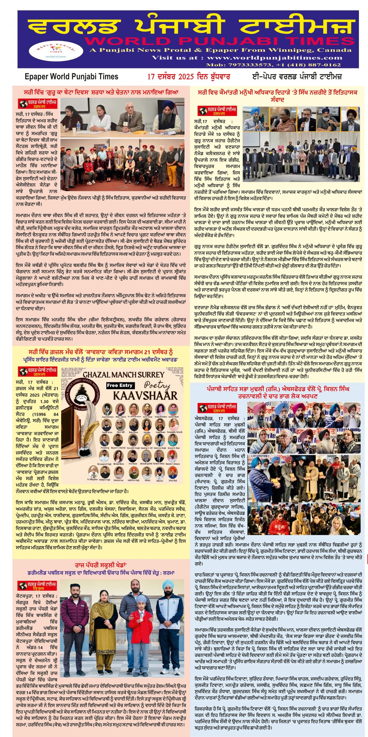 Posted inਈ-ਪੇਪਰ World Punjabi Times-17.12.2025 17.12.25Download Posted by worldpunjabitimes December 17, 2025 Posted inਸਾਹਿਤ ਸਭਿਆਚਾਰ ਸੰਘਰਸ਼ ਦੇ ਦੌਰ ਦਾ ਦੂਸਰਾ ਅਡੀਸ਼ਨ ਕੈਨੇਡਾ ਦੇ ਬੀ.ਸੀ ਵਿੱਚ ਸਿੱਖ ਆਗੂਆਂ ਨੇ ਜਾਰੀ ਕੀਤਾ ਬੀ.ਸੀ-ਭਾਈ ਲਵਸ਼ਿੰਦਰ ਸਿੰਘ ਡੱਲੇਵਾਲ ਵੱਲੋਂ ਲਿਖੀ ਅਤੇ ਬੀਬੀ ਰਸ਼ਪਿੰਦਰ ਕੌਰ ਗਿੱਲ ਵੱਲੋਂ ਸੰਪਾਦਤ ਕੀਤੀ ਗਈ ਕਿਤਾਬ ਸੰਘਰਸ਼ ਦਾ ਦੌਰ ਦਾ ਦੂਸਰਾ ਅਡੀਸ਼ਨ ਕੈਨੇਡਾ ਦੇ ਬੀ.ਸੀ ਵਿੱਚ ਖਾਲਿਸਤਾਨੀ ਆਗੂਆਂ ਅਤੇ ਸ਼ਹੀਦ… Posted by worldpunjabitimes December 17, 2025 Posted inਪੰਜਾਬ ਸਾਹਿਤ ਵਿਗਿਆਨ ਕੇਂਦਰ ਵੱਲੋਂ ਪੁਸਤਕ ਲੋਕ ਅਰਪਣ ਸਮਾਗਮ ਚੰਡੀਗੜ੍ਹ 17 ਦਸੰਬਰ (ਵਰਲਡ ਪੰਜਾਬੀ ਟਾਈਮਜ਼) ਸਾਹਿਤ ਵਿਗਿਆਨ ਕੇਂਦਰ ਚੰਡੀਗੜ੍ਹ ਵਲੋਂ ਰੋਟਰੀ ਕਲੱਬ ਸੈਕਟਰ 70 ਮੁਹਾਲੀ ਵਿਖੇ ਡਾ. ਮਨਜੀਤ ਸਿੰਘ ਮਝੈਲ ਦੀਆਂ ਦੋ ਪੁਸਤਕਾਂ “ਕਾਸਾ ਜ਼ਿੰਦਗੀ ਦਾ ਅਤੇ ਵਕਤ ਦੇ… Posted by worldpunjabitimes December 17, 2025 Posted inਪੰਜਾਬ ਚੈੱਕ ਬਾਉਂਸ ਦੇ ਕੇਸ ਵਿੱਚ ਅਦਾਲਤ ਨੇ ਸੁਣਾਈ ਦੋ ਸਾਲ ਦੀ ਕੈਦ ਦੀ ਸਜ਼ਾ ਕੋਟਕਪੂਰਾ, 17 ਦਸੰਬਰ (ਟਿੰਕੂ ਕੁਮਾਰ/ਵਰਲਡ ਪੰਜਾਬੀ ਟਾਈਮਜ਼) ਮਾਣਯੋਗ ਅਦਾਲਤ ਵਲੋਂ ਚੈੱਕ ਬਾਉਂਸ ਦੇ ਕੇਸ ਵਿੱਚ ਦੋਸ਼ੀ ਨੂੰ ਦੋ ਸਾਲ ਕੈਦ ਦੀ ਸਜਾ ਸੁਣਾਈ ਗਈ। ਸ਼ਿਕਾਇਤ ਕਰਤਾ ਲਵਪ੍ਰੀਤ ਸਿੰਘ ਪੁੱਤਰ ਸ਼ਵਿੰਦਰ… Posted by worldpunjabitimes December 17, 2025 Posted inਸਾਹਿਤ ਸਭਿਆਚਾਰ ਪਿੰਡ ਦਾ ਜਿੰਨ ਫੜਿਆ ਮੈਨੂੰ ਯਾਦ ਹੈ ਕਿ ਕਾਫੀ ਸਾਲ ਪਹਿਲਾਂ ਜਦ ਮੈਂ ਤਰਕਸ਼ੀਲ ਸੁਸਾਇਟੀ ਪੰਜਾਬ ਇਕਾਈ ਲਹਿਰਾਗਾਗੇ ਵਿਚ ਕੰਮ ਕਰਦਾ ਸੀ, ਇਕਾਈ ਕੋਲ ਹਰਿਆਣੇ ਦੇ ਸ਼ਹਿਰ ਟੁਹਾਣੇ ਨੇੜਲੇ ਪਿੰਡ ਖਨੌਰੇ ਦੀ ਪੰਚਾਇਤ ਆਈ… Posted by worldpunjabitimes December 17, 2025 Posted inਖੇਡ ਜਗਤ ਪੰਜਾਬ ਰਾਜ ਪੱਧਰੀ ਸਕੂਲੀ ਖੇਡਾਂ’ ਡਰੀਮਲੈਂਡ ਪਬਲਿਕ ਸਕੂਲ ਦਾ ਵਿਦਿਆਰਥੀ ਓਂਕਾਰ ਸਿੰਘ ਪੰਜਾਬ ਵਿੱਚੋਂ ਜੇਤੂ : ਸ਼ਰਮਾ ਕੋਟਕਪੂਰਾ, 17 ਦਸੰਬਰ (ਟਿੰਕੂ ਕੁਮਾਰ/ਵਰਲਡ ਪੰਜਾਬੀ ਟਾਈਮਜ਼) ਸੰਗਰੂਰ ਵਿਖੇ ਹੋਈਆਂ ਸਕੂਲੀ ਰਾਜ ਪੱਧਰੀ ਖੇਡਾਂ ਵਿੱਚ ਕਿੱਕ ਬਾਕਸਿੰਗ ਦੇ… Posted by worldpunjabitimes December 17, 2025