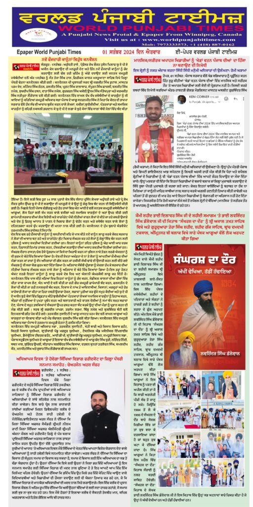 Posted inਈ-ਪੇਪਰ World Punjabi Times-01.09.2024 Posted by worldpunjabitimes September 1, 2024No Comments 01.09.2024Download worldpunjabitimes View All Posts Post navigation Previous Post ਮਾਨਸਿਕ/ਸਰੀਰਕ ਅਪਾਹਜ ਖਿਡਾਰੀਆਂ ਨੂੰ ‘ਖੇਡਾਂ ਵਤਨ ਪੰਜਾਬ ਦੀਆਂ’ ਦਾ ਹਿੱਸਾ ਨਾ ਬਣਾਉਣ ਦੀ ਨਿਖੇਧੀNext Post105 ਜਨਮ ਦਿਨ ਮਨਾ ਕੇ ਖੋਜੀ ਵਿਦਵਾਨ ਲੇਖਕ ਈਸ਼ਰ ਸਿੰਘ ਸੋਬਤੀ ਲੁਧਿਆਣਾ ਵਿੱਚ ਸੁਰਗਵਾਸ