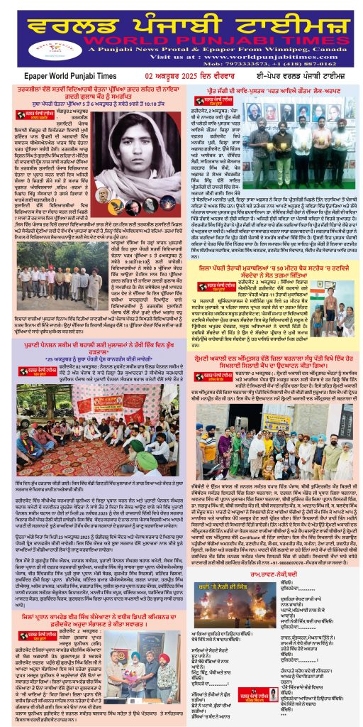 Posted inਈ-ਪੇਪਰ World Punjabi Times-02.10.2025 Posted by worldpunjabitimes October 2, 2025No Comments 02.10.2025Download Share this:Post Click to share on WhatsApp (Opens in new window) WhatsApp worldpunjabitimes View All Posts Post navigation Previous Post ਤਰਕਸ਼ੀਲਾਂ ਵੱਲੋਂ ਸਤਵੀਂ ਵਿਦਿਆਰਥੀ ਚੇਤਨਾ ਪ੍ਰੀਖਿਆ ਗ਼ਦਰ ਲਹਿਰ ਦੀ ਨਾਇਕਾ ਗ਼ਦਰੀ ਗੁਲਾਬ ਕੌਰ ਨੂੰ ਸਮਰਪਿਤNext Postਇੰਡੋ ਕਨੇਡੀਅਨ ਸੀਨੀਅਰ ਸੈਂਟਰ ਦਾ ਮਹੀਨਾਵਾਰ ਕਵੀ ਦਰਬਾਰ