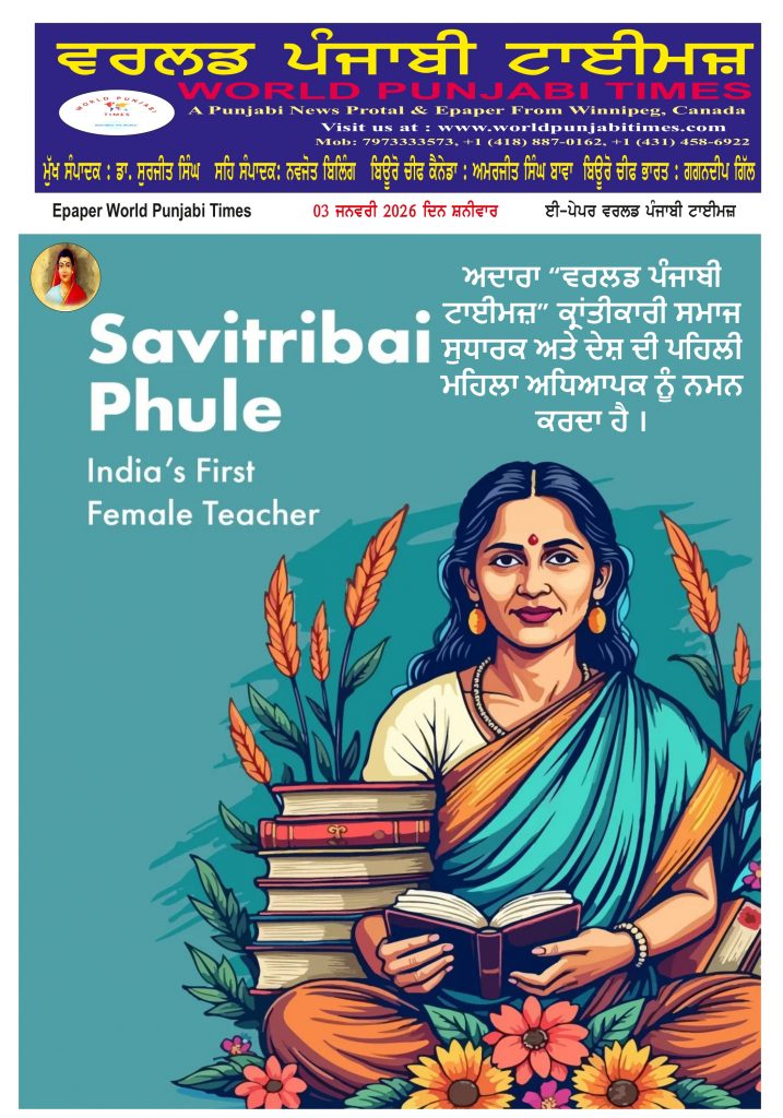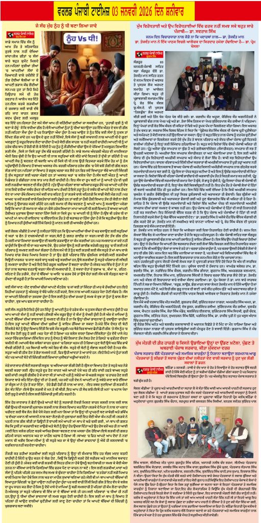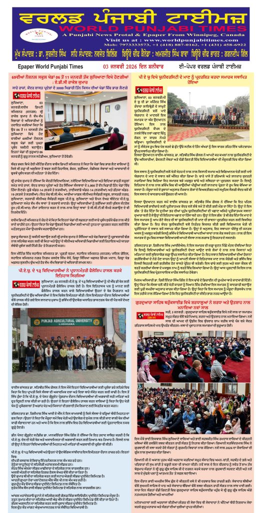 Posted inਈ-ਪੇਪਰ World Punjabi Times-03.01.2026 Posted by worldpunjabitimes January 3, 2026No Comments 03.01.26Download Share this:Post Click to share on WhatsApp (Opens in new window) WhatsApp worldpunjabitimes View All Posts Post navigation Previous Post ਜੇ ਸੱਚ ਮੁੱਚ ਨੂੰਹ ਨੂੰ ਧੀ ਬਣਾ ਲਿਆ ਜਾਵੇNext Postਗੁਰਦਾਸ ਮਾਨ: ਆਵਾਜ਼ ਜੋ ਯੁੱਗ ਬਣ ਗਈ