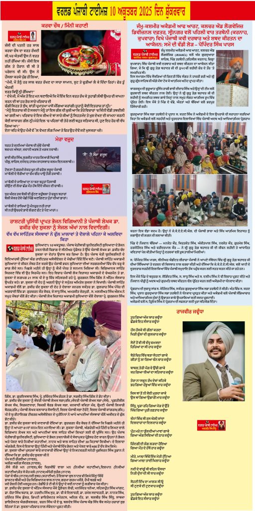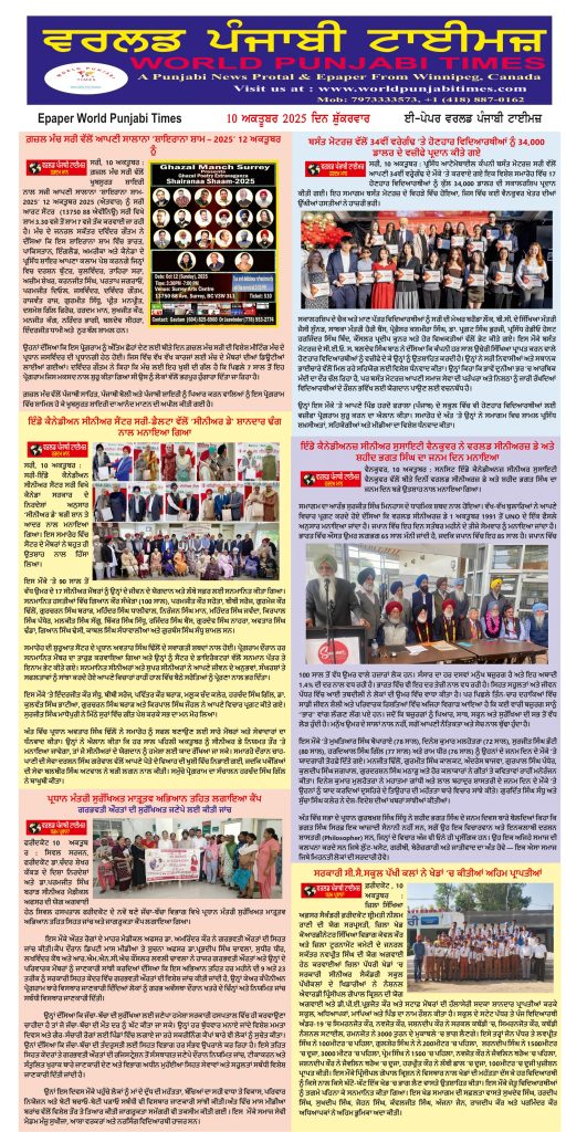 Posted inਈ-ਪੇਪਰ World Punjabi Times-10.10.2025 Posted by worldpunjabitimes October 10, 2025No Comments 10.10.25Download worldpunjabitimes View All Posts Post navigation Previous Post ਵਿਦਿਆਰਥੀਆਂ ਦੀ ਸ਼ਖ਼ਸੀਅਤ ਨਿਖਾਰਨ ਲਈ ਪ੍ਰਤਿਭਾ ਖੋਜ ਮੁਕਾਬਲਿਆਂ ਦਾ ਅਹਿਮ ਯੋਗਦਾਨ: ਪ੍ਰਿੰਸੀਪਲ ਡਾ. ਹਰਦੀਪ ਸਿੰਘNext Postਮਾਰੀਆ ਕੋਰੀਨਾ ਮਸਾਡੋ ਨੂੰ ਮਿਲਿਆ 2025 ਦਾ ਨੋਬਲ ਸ਼ਾਂਤੀ ਇਨਾਮ