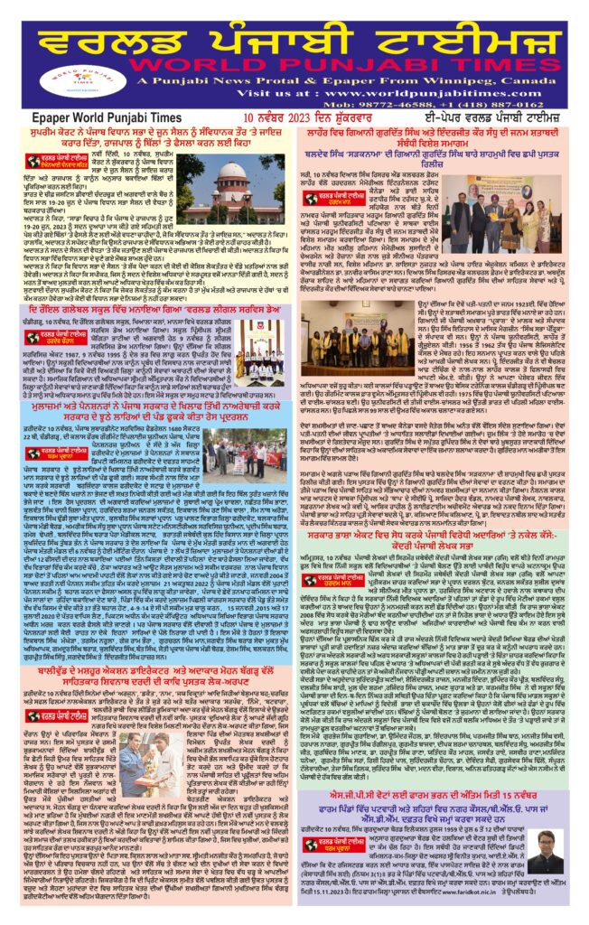 Posted inਈ-ਪੇਪਰ World Punjabi times 10.11.2023 Posted by worldpunjabitimes November 10, 2023No Comments 10.11.2023Download worldpunjabitimes View All Posts Post navigation Previous Post ਸੁਪਰੀਮ ਕੋਰਟ ਨੇ ਪੰਜਾਬ ਵਿਧਾਨ ਸਭਾ ਦੇ ਜੂਨ ਸੈਸ਼ਨ ਨੂੰ ਸੰਵਿਧਾਨਕ ਤੌਰ ‘ਤੇ ਜਾਇਜ਼ ਕਰਾਰ ਦਿੱਤਾ, ਰਾਜਪਾਲ ਨੂੰ ਬਿੱਲਾਂ ‘ਤੇ ਫੈਸਲਾ ਕਰਨ ਲਈ ਕਿਹਾNext Postਜਨਤਕ ਜਮਹੂਰੀ ਜਥੇਬੰਦੀਆਂ ਅਤੇ ਹੋਰ ਇਨਸਾਫ਼ ਪਸੰਦ ਲੋਕਾਂ ਦੇ ਸਹਿਯੋਗ ਨਾਲ 19 ਨਵੰਬਰ ਨੂੰ ਸੰਗਰੂਰ ਵਿਖੇ ਵਿਰੋਧ ਪ੍ਰਦਰਸ਼ਨ