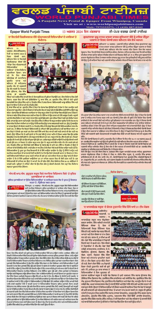 Posted inਈ-ਪੇਪਰ World Punjabi Times-13.08.2024 Posted by worldpunjabitimes August 13, 2024No Comments 13.08.2024Download Share this:Post Share on WhatsApp (Opens in new window) WhatsApp worldpunjabitimes View All Posts Post navigation Previous Post ਪੰਜਾਬ ਮੰਡੀ ਬੋਰਡ ਦੇ ਚੇਅਰਮੈਨ ਹਰਚੰਦ ਸਿੰਘ ਬਰਸਟ ਵੱਲੋਂ ਫਰੀਦਕੋਟ ਮਾਰਕਿਟ ਕਮੇਟੀ ਦਾ ਦੌਰਾNext Postਲੋਕ ਗਾਇਕ ਬਲਧੀਰ ਮਾਹਲਾ ਦਾ 1947 ਤੋਂ ਲੈਕੇ ਮੌਜੂਦਾ ਦਰਦਾਂ ਨੂੰ ਬਿਆਨ ਦਾ ਗੀਤ ਦਰਦ ਏ ਪੰਜਾਬ ਅੱਜ ਹੋਵੇਗਾ ਰਿਲੀਜ਼