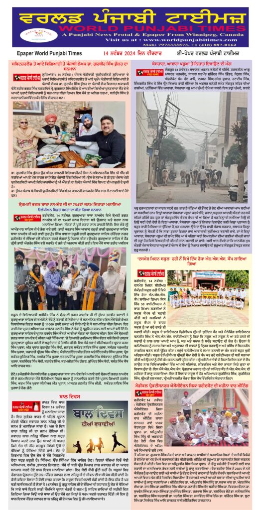 Posted inਈ-ਪੇਪਰ World Punjabi Times-14.11.2024 Posted by worldpunjabitimes November 14, 2024No Comments 14.11.24Download worldpunjabitimes View All Posts Post navigation Previous Post ਗੁਰੂ ਨਾਨਕ ਬਾਣੀ ਵਿਚ ਕੁਦਰਤ ਦਾ ਖੂਬਸੂਰਤ ਵਰਣਨ : ਮਾਨਵਤਾ ਲਈ ਪ੍ਰਤੀਕਾਤਮਿਕ ਸੰਦੇਸ਼Next Postਸਾਬਕਾ ਸਿਵਲ ਸਰਜਨ ਬਠਿੰਡਾ ਦੀ ਕਿਤਾਬ ਪੀ. ਪੀ. ਐਸ. ਨਾਭਾ ਵਿਖੇ ਰਿਲੀਜ਼