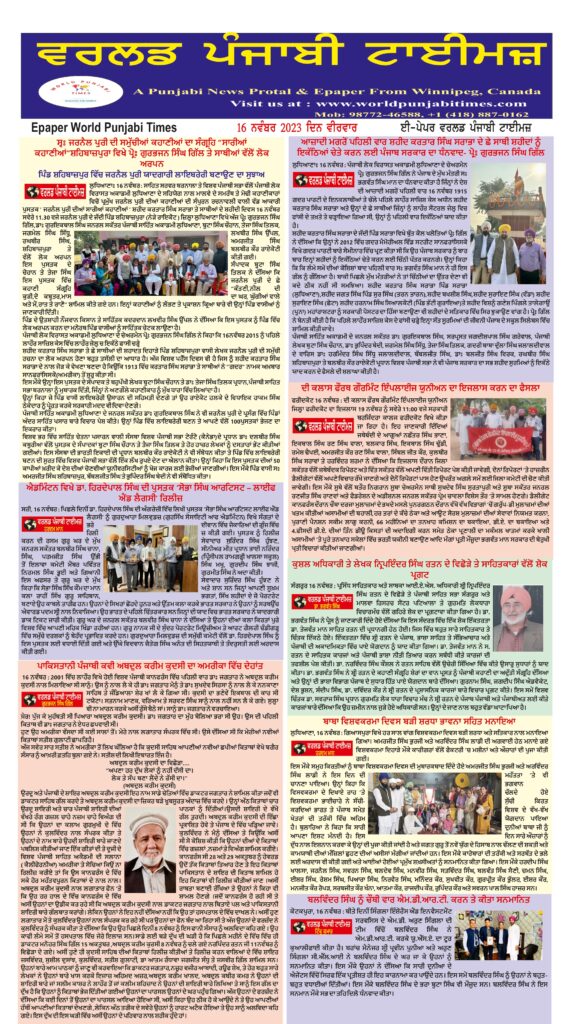 Posted inਈ-ਪੇਪਰ World Punjabi Times – 16.11.2023 Posted by worldpunjabitimes November 16, 2023No Comments 16.11.2023Download worldpunjabitimes View All Posts Post navigation Previous Post ਸ੍ਵਃ ਜਰਨੈਲ ਪੁਰੀ ਦੀ ਸਮੁੱਚੀਆਂ ਕਹਾਣੀਆਂ ਦਾ ਸੰਗ੍ਰਹਿ “ਸਾਰੀਆਂ ਕਹਾਣੀਆਂ”ਸ਼ਹਿਬਾਜ਼ਪੁਰਾ ਵਿਖੇ ਪ੍ਰੋਃ ਗੁਰਭਜਨ ਸਿੰਘ ਗਿੱਲ ਤੇ ਸਾਥੀਆਂ ਵੱਲੋਂ ਲੋਕ ਅਰਪਨNext Postਅਧਿਆਪਕ ਆਗੂ ਪ੍ਰੇਮ ਚਾਵਲਾ ਨੇ ਆਪਣੇ ਮਾਤਾ ਆਗਿਆ ਵੰਤੀ ਚਾਵਲਾ ਜੀ ਦੀ ਯਾਦ ਵਿੱਚ ਸਰਕਾਰੀ ਹਾਈ ਸਕੂਲ ਔਲਖ ਦੇ 234 ਵਿਦਿਆਰਥੀਆਂ ਲਈ ਸ਼ਨਾਖ਼ਤੀ ਕਾਰਡ ਬਣਾਕੇ ਵੰਡੇ ਗਏ