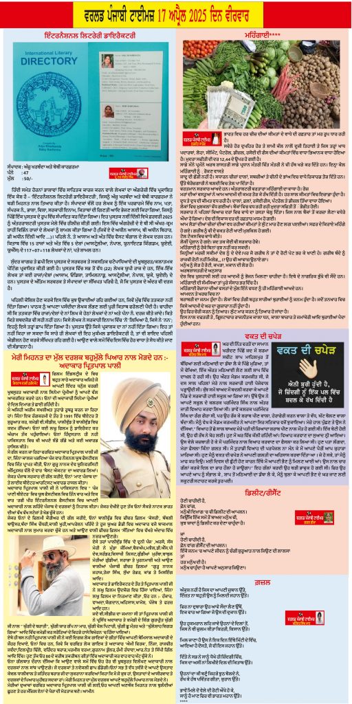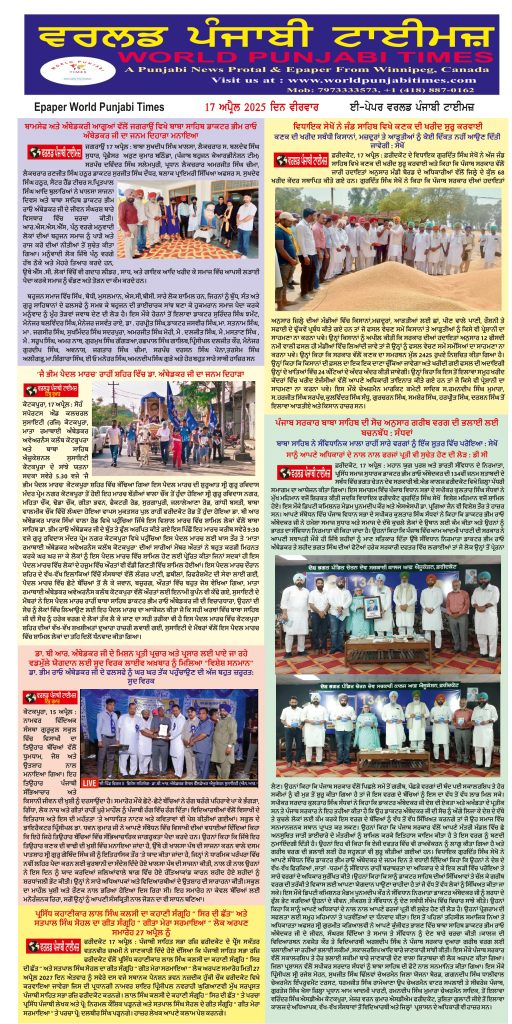 Posted inਈ-ਪੇਪਰ World Punjabi Times-17.04.25 Posted by worldpunjabitimes April 17, 2025No Comments 17.04.25Download worldpunjabitimes View All Posts Post navigation Previous Post ਪ੍ਰਸਿੱਧ ਕਹਾਣੀਕਾਰ ਲਾਲ ਸਿੰਘ ਕਲਸੀ ਦਾ ਕਹਾਣੀ ਸੰਗ੍ਰਹਿ “ ਸਿਰ ਦੀ ਛੱਤ” ਅਤੇ ਸਤਪਾਲ ਸਿੰਘ ਸੋਹਲ ਦਾ ਗੀਤ ਸੰਗ੍ਰਹਿ “ ਗੀਤਾ ਮੇਰਾ ਸਰਮਾਇਆ “ ਲੋਕ ਅਰਪਣ ਸਮਾਰੋਹ 27 ਅਪ੍ਰੈਲ ਨੂੰNext Postਗੁਰਦੁਆਰਾ ਸਾਹਿਬ ਬਰੁੱਕਸਾਈਡ ਵਿਖੇ ਖਾਲਸਾ ਸਾਜਨਾ ਦਿਵਸ ਤੇ ਵਿਸਾਖੀ ਦਿਹਾੜਾ ਸ਼ਰਧਾ ਨਾਲ ਮਨਾਇਆ ਗਿਆ
