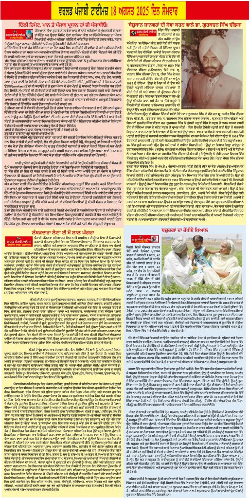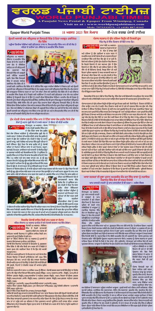 Posted inਈ-ਪੇਪਰ World Punjabi Times-18.08.2025 Posted by worldpunjabitimes August 18, 2025No Comments 18.08.25Download worldpunjabitimes View All Posts Post navigation Previous Post ਸਿਰਕੱਢ ਪੰਜਾਬੀ ਸ਼ਾਇਰ ਸ਼ਿਰੀ ਰਾਮ ਅਰਸ਼ ਦਾ ਦੇਹਾਂਤNext Postਹੜ੍ਹ