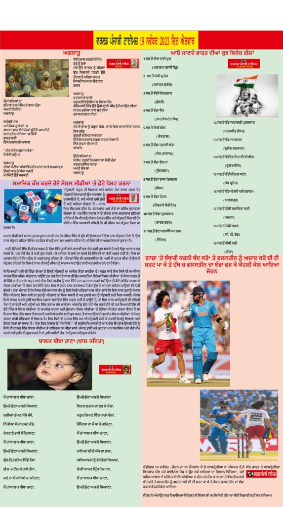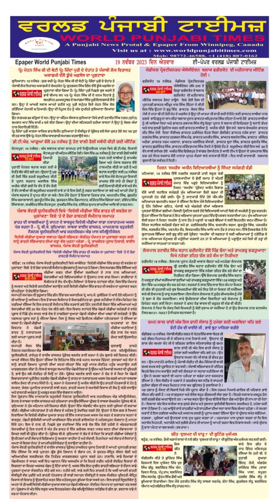 Posted inਈ-ਪੇਪਰ World Punjabi Times 19.11.2023 Posted by worldpunjabitimes November 19, 2023No Comments 19.11.2023Download worldpunjabitimes View All Posts Post navigation Previous Post ਗਾਜ਼ਾ ‘ਤੇ ਬੰਬਾਰੀ ਕਰਨੀ ਬੰਦ ਕਰੋ* ਤੇ ਫਲਸਤੀਨ ਨੂੰ ਅਜ਼ਾਦ ਕਰੋ ਦੀ ਟੀ ਸ਼ਰਟ ਪਾ ਕੇ ਤੇ ਹੱਥ ਚ ਫਲਸਤੀਨ ਦਾ ਝੰਡਾ ਫੜ ਕੇ ਕੋਹਲੀ ਕੋਲ ਆਇਆ ਜੋਹਨNext Post ਉਰਦੂ ਅਤੇ ਪੰਜਾਬੀ ਦੇ ਨਾਮਵਰ ਸ਼ਾਇਰ ਗੁਰਚਰਨ ਸਿੰਘ ਗਿੱਲ ਮਨਸੂਰ ਨਹੀਂ ਰਹੇ