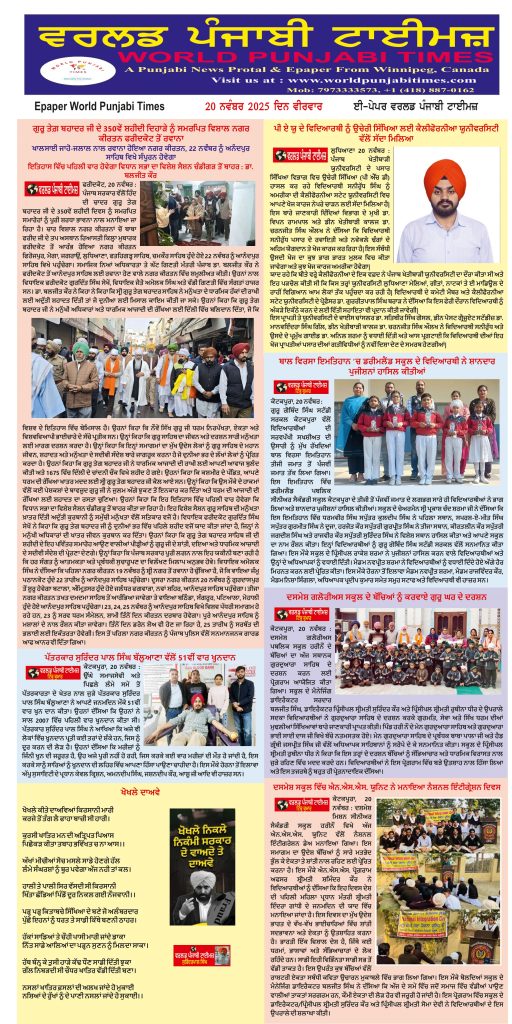 Posted inਈ-ਪੇਪਰ World Punjabi Times-20.11.2025 Posted by worldpunjabitimes November 20, 2025No Comments 20.11.25Download worldpunjabitimes View All Posts Post navigation Previous Post ਪੀ ਏ ਯੂ ਦੇ ਵਿਦਿਆਰਥੀ ਨੂੰ ਉਚੇਰੀ ਸਿੱਖਿਆ ਲਈ ਕੈਲੀਫੋਰਨੀਆ ਯੂਨੀਵਰਸਿਟੀ ਵੱਲੋਂ ਸੱਦਾ ਮਿਲਿਆNext Postਇਤਿਹਾਸ