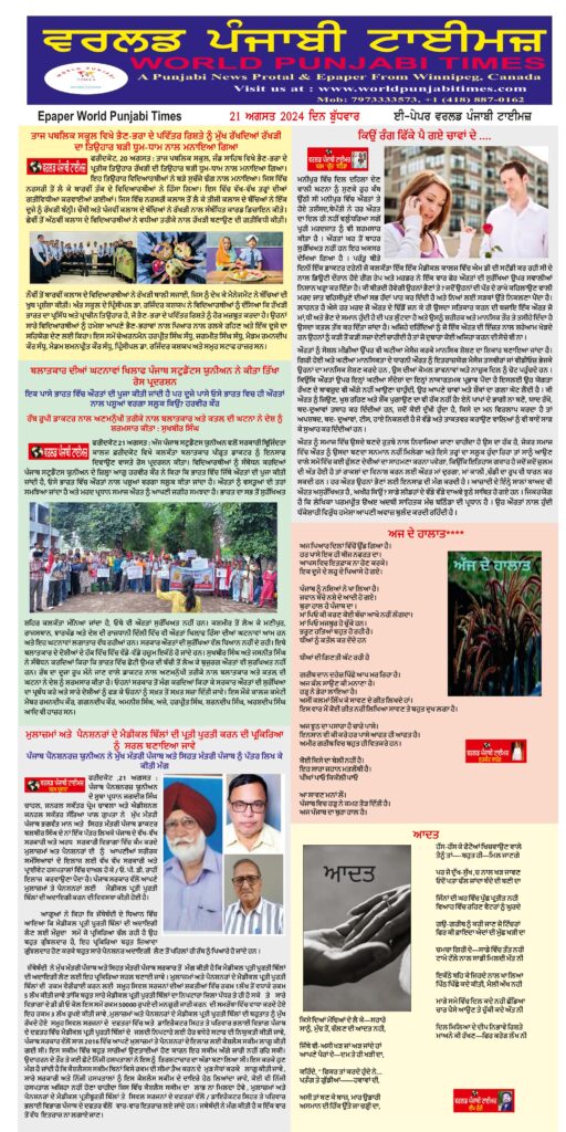 Posted inਈ-ਪੇਪਰ World Punjabi Times-21.08.2024 Posted by worldpunjabitimes August 21, 20241 21.08.2024Download worldpunjabitimes View All Posts Post navigation Previous Post ਨਵੇਂ ਫੌਜਦਾਰੀ ਕਾਨੂੰਨਾਂ ਵਿਰੁੱਧ ਕਨਵੈਂਸ਼ਨ ਇੱਕ ਸਤੰਬਰ ਨੂੰNext Postਗੁਰਮੀਤ ਸਿੱਧੂ ਦੇ ਪਲੇਠੇ ਗ਼ਜ਼ਲ ਸੰਗ੍ਰਹਿ ‘ਪਿੰਡ ਤੋਂ ਬ੍ਰਹਿਮੰਡ’ ਦਾ ਰਿਲੀਜ਼ ਸਮਾਗਮ
