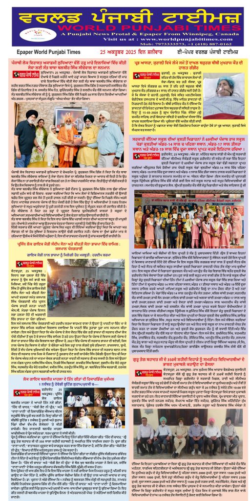 Posted inਈ-ਪੇਪਰ World Punjabi Times-25.10.2025 Posted by worldpunjabitimes October 25, 2025No Comments 25.10.25Download Share this:Post Click to share on WhatsApp (Opens in new window) WhatsApp worldpunjabitimes View All Posts Post navigation Previous Post ਪੰਜਾਬ ਸਟੂਡੈਂਟਸ ਯੂਨੀਅਨ ਵੱਲੋਂ ਸਰਕਾਰੀ ਬ੍ਰਿਜਿੰਦਰਾ ਕਾਲਜ ਵਿਖੇ ‘ਬਲੈਕ ਡੇ’ ਮਨਾਇਆNext Postਸ਼ਮਸ਼ੇਰ ਸ਼ੇਰੀ ਦੀ ਬਰਸੀ ਮਨਾਉਣ ਸਬੰਧੀ ਮੀਟਿੰਗ ਹੋਈ