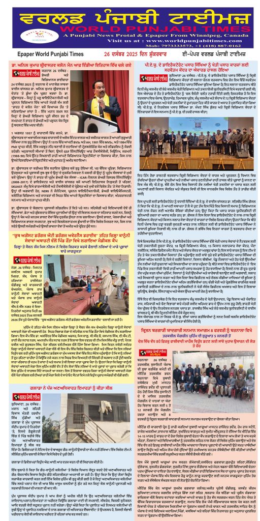 Posted inਈ-ਪੇਪਰ World Punjabi Times-26.12.2025 Posted by worldpunjabitimes December 26, 2025No Comments 26.12.2025Download worldpunjabitimes View All Posts Post navigation Previous Post “ਯੂਥ ਅਗੇਂਸਟ ਡਰੱਗਜ ਐਂਟੀ ਡਰੱਗਜ ਅਵੇਰਨੈੱਸ ਡਰਾਈਵ” ਤਹਿਤ ਜ਼ਿਲ੍ਹਾ ਕਾਨੂੰਨੀ ਸੇਵਾਵਾਂ ਅਥਾਰਟੀ ਵੱਲੋਂ ਪਿੰਡ ਰੌਂਤਾ ਵਿਖੇ ਲਗਾਇਆ ਮੈਡੀਕਲ ਕੈਂਪNext Postਸੰਗਰੂਰ ਦੇ ਇੱਕ ਛੋਟੇ ਜਿਹੇ ਪਿੰਡ ਦੀ ਰਹਿਣ ਵਾਲੀ ਅੰਮ੍ਰਿਤ ਕੌਰ ਦੀ ਕਹਾਣੀ