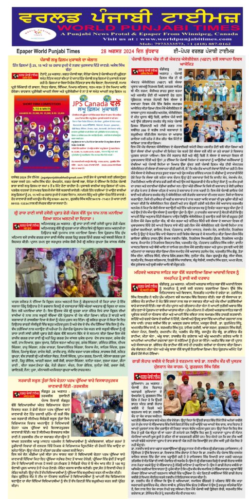 Posted inਈ-ਪੇਪਰ World Punjabi Times-28.08.2024 Posted by worldpunjabitimes August 28, 2024No Comments 28.08.24Download worldpunjabitimes View All Posts Post navigation Previous Post ਮਾਊਂਟ ਲਿਟਰਾ ਜ਼ੀ ਸਕੂਲ ਦੇ ਵਿਦਿਆਰਥੀਆਂ ਨੇ ਜੌਹਨ ਟੂਰਨਾਮੈਂਟ ਵਿੱਚ ਸ਼ਾਨਦਾਰ ਪ੍ਰਦਰਸ਼ਨ ਕੀਤਾNext Postਨੀਵਾਂ ਹੋ ਕੇ ਚੱਲ ਬੰਦਿਆ