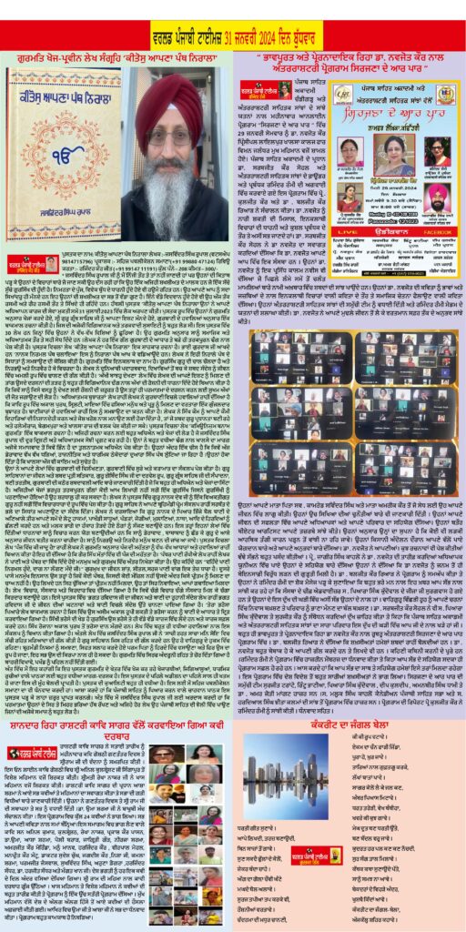Posted inਈ-ਪੇਪਰ World Punjabi Times-31.01.2024 Posted by worldpunjabitimes January 31, 2024No Comments 31.01.24Download worldpunjabitimes View All Posts Post navigation Previous Post 4 ਫਰਵਰੀ 2024 ਨੂੰ ਗੁਰਦੁਆਰਾ ਸਿੰਘ ਸਭਾ, ਨੋਵੇਲਾਰਾ ਵਿਖੇ ਲਗਾਇਆ ਜਾਵੇਗਾ ਭਾਈ ਮਨੀ ਸਿੰਘ ਦਸਤਾਰ ਸੇਵਾ ਸਿਖਲਾਈ ਵਾਲੇ ਵੀਰਾਂ ਵੱਲੋਂ ਦਸਤਾਰ ਸਿਖਲਾਈ ਕੈਂਪNext Postਜ਼ਿਲ੍ਹਾ ਪੱਧਰ ਤੇ ਅਭੀਜੋਤ ਨੇ ਦੂਜਾ ਸਥਾਨ ਪ੍ਰਾਪਤ ਕੀਤਾ